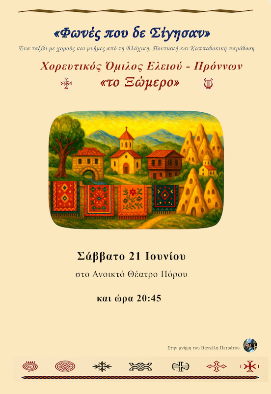 Ο Χορευτικός Όμιλος Ελειού-Πρόννων Κεφαλονιάς “Το Ξώμερο” σας προσκαλεί στη μουσικοχορευτική του εκδήλωση που θα πραγματοποιηθεί το Σάββατο 21 Ιουνίου, στις 20:45, στο Ανοικτό Θέατρο Πόρου “Γεράσιμος Πεντόγαλος”.