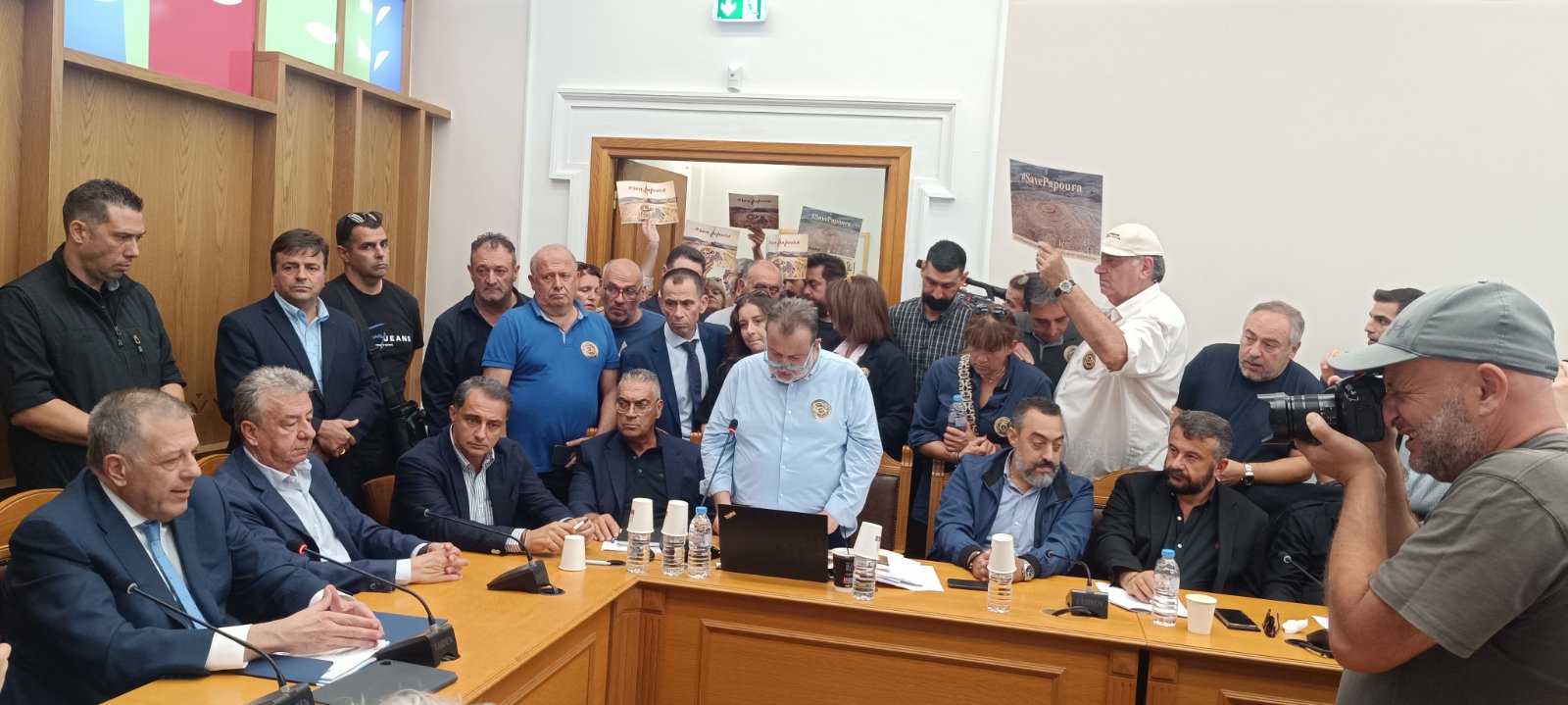 Λίγο πριν από την άφιξη του κ. Ταχιάου στην Περιφέρεια Κρήτης, είχε προγραμματιστεί συγκέντρωση διαμαρτυρίας από φορείς και κατοίκους του δήμου Μινώα Πεδιάδας με επικεφαλής το δήμαρχο Βασίλη Κεγκέρογλου, ο οποίος δεν παρέστη στη σύσκεψη των δημάρχων, ωστόσο κατέθεσε στον κ. Ταχιάο μια σειρά από εναλλακτικές προτάσεις για τη χωροθέτηση του ραντάρ σε άλλο σημείο. Μάλιστα ανάμεσα στον υφυπουργό και το δήμαρχο υπήρξαν στιγμές έντασης, με προσωπικές αντεγκλήσεις, ενώ παρόντες ήταν αρκετοί κάτοικοι της περιοχής με φωτογραφίες του μνημείου και συνθήματα. Σε κάθε περίπτωση ο κ. Ταχιάος ξεκαθάρισε ότι το Κεντρικό Αρχαιολογικό Συμβούλιο ήταν αυτό που ενέκρινε τη θέση του ραντάρ και όχι το υπουργείο υποδομών και μεταφορών.