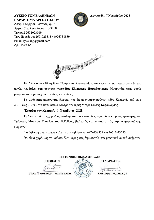 Νέα χορωδία Ελληνικής παραδοσιακής μουσικής από το Λύκειο των Ελληνίδων Αργοστολίου
