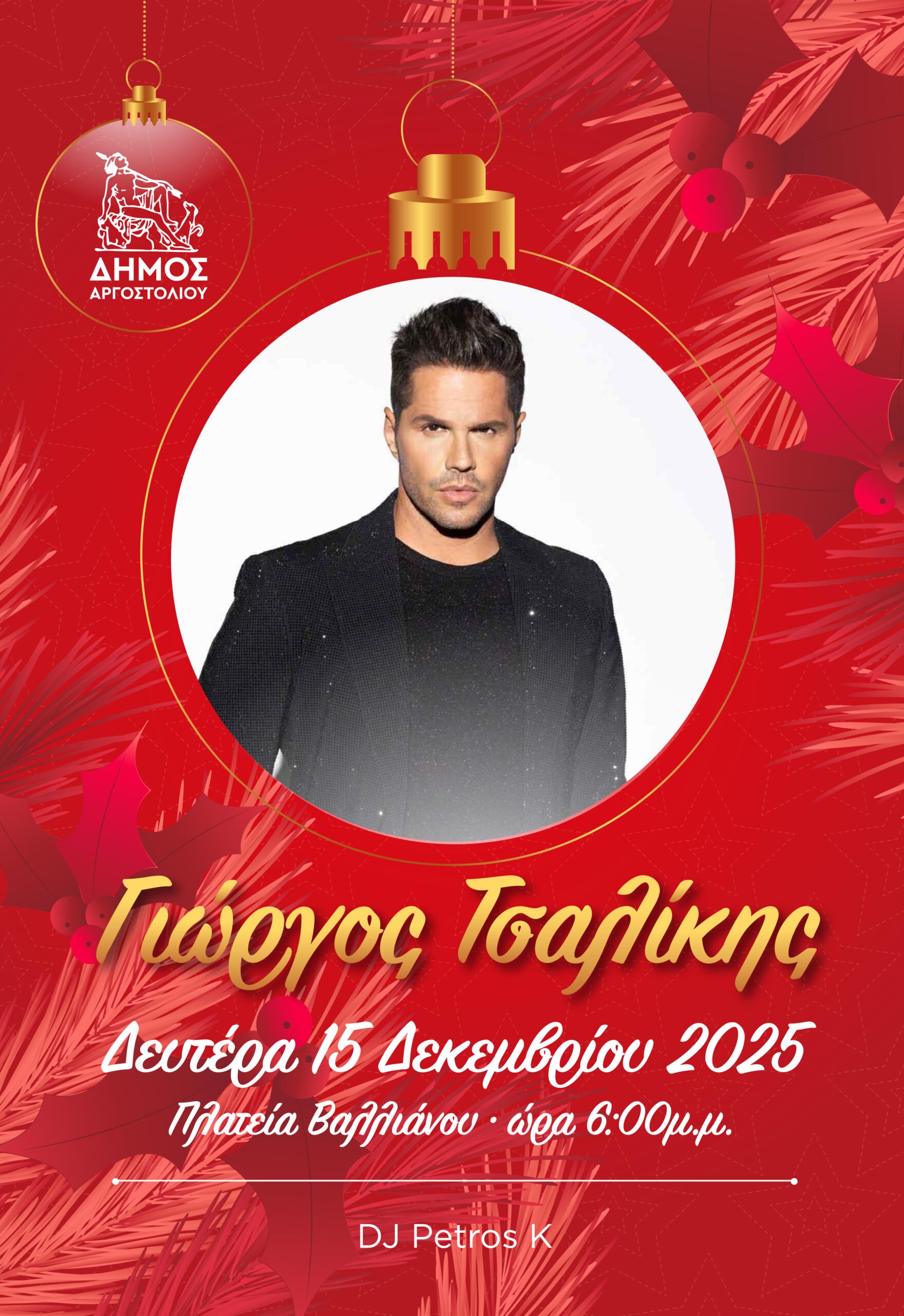 Την Δευτέρα 15 Δεκεμβρίου 2025, στις 6 μ.μ., στην κεντρική πλατεία Αργοστολίου, ο αγαπημένος καλλιτέχνης Γιώργος Τσαλίκης, θα μας χαρίσει μια μοναδική συναυλία, γεμάτη αγαπημένα τραγούδια, ρυθμό, κέφι και εορταστική διάθεση!