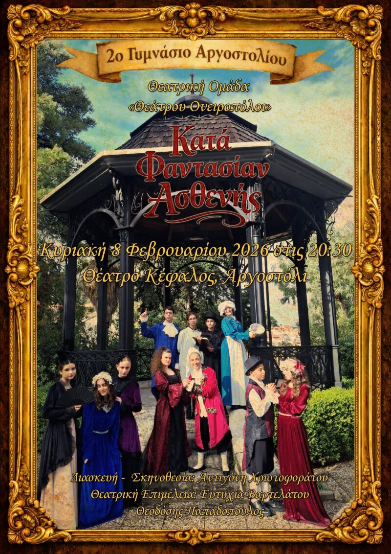 Το 2ο Γυμνάσιο Αργοστολίου «Ιωσήφ Μομφερράτος» και η θεατρική ομάδα «Θέατρο Ονειροπόλοι» ανεβάζουν στη σκηνή την κλασική κωμωδία του Μολιέρου «Ο Κατά Φαντασίαν Ασθενής», σε μια απολαυστική παράσταση γεμάτη χιούμορ, σάτιρα και ζωντάνια.