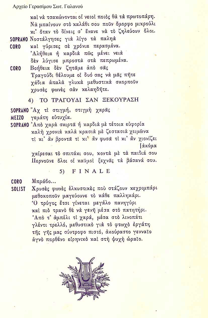 Πρόκειται για ένα μελωδικό έργο με κεφαλληνιακή κανταδόρικη μουσική γραφή, αξιοποιώντας όλες τις φωνές της κλασικής τετραφωνίας, αντλώντας συγχρόνως και μελωδίες από τη λαϊκή μουσική. Ενδιαφέρον είναι πως στο έργο αυτό, όπως και άλλα παρόμοια του συνθέτη, φανερώνεται η στιχουργική ποιητική ευαισθησία του, που είχε τη δύναμη να τη ντύσει μελωδικά, χωρίς η μουσική του να είναι σε βάρος του στίχου.