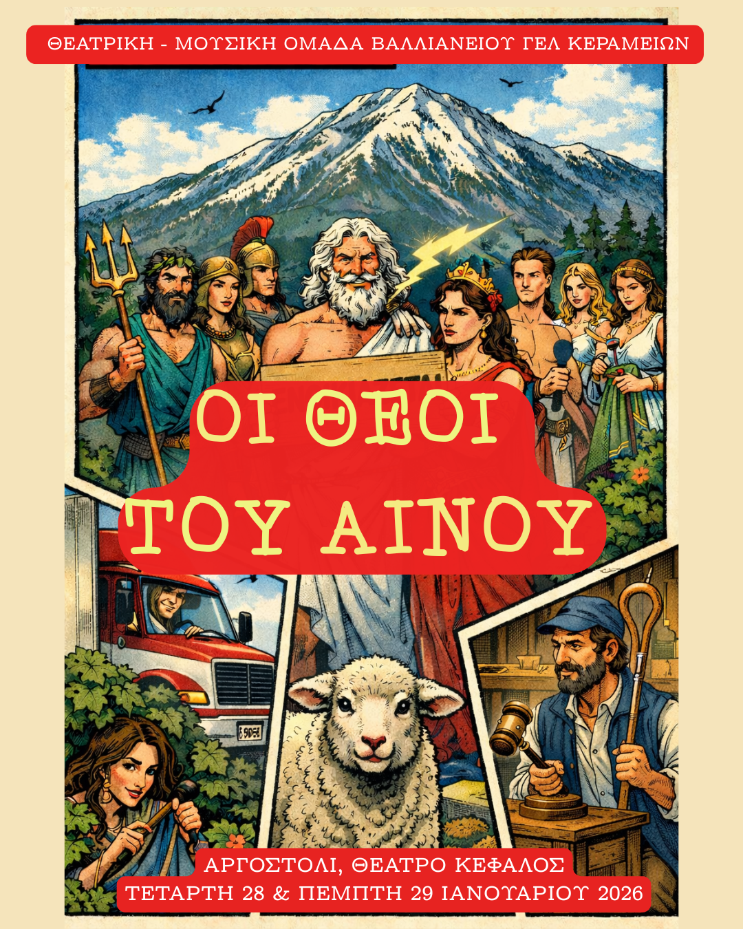 Η θεατρική και μουσική ομάδα του Βαλλιανείου Λυκείου Κεραμειών παρουσιάζει την κωμωδία (μετ’ ασμάτων) « Οι θεοί του Αίνου», στο Δημοτικό Θέατρο «Ο Κέφαλος» του Αργοστολίου, την Τετάρτη 28 και την Πέμπτη 29 Ιανουαρίου 2026 και ώρα 07:30 το απόγευμα.