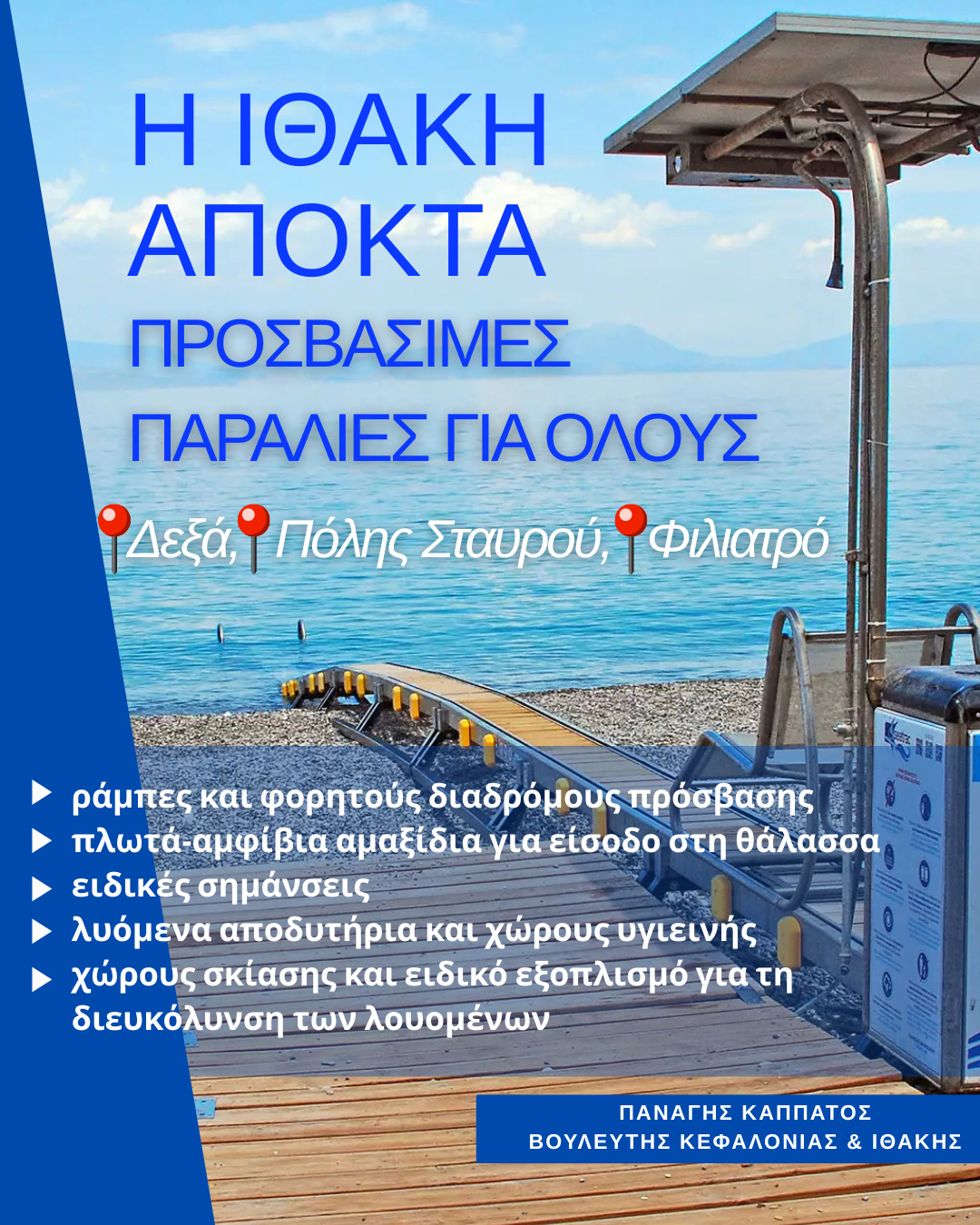 Ταυτόχρονα, θέλω να τονίσω ότι και στην Κεφαλονιά έχουμε ήδη δει τα τελευταία καλοκαίρια σημαντικές παρεμβάσεις σε παραλίες, με αντίστοιχα συστήματα πρόσβασης για άτομα με αναπηρία ΑμεΑ. Αυτό δείχνει ότι η προσπάθεια αυτή δεν αφορά μόνο μεμονωμένες περιοχές, αλλά μια συνολική πολιτική της Κυβέρνησης που μεταμορφώνει τα νησιά μας και όλη την Ελλάδα σε έναν πιο φιλικό και ισότιμο προορισμό.