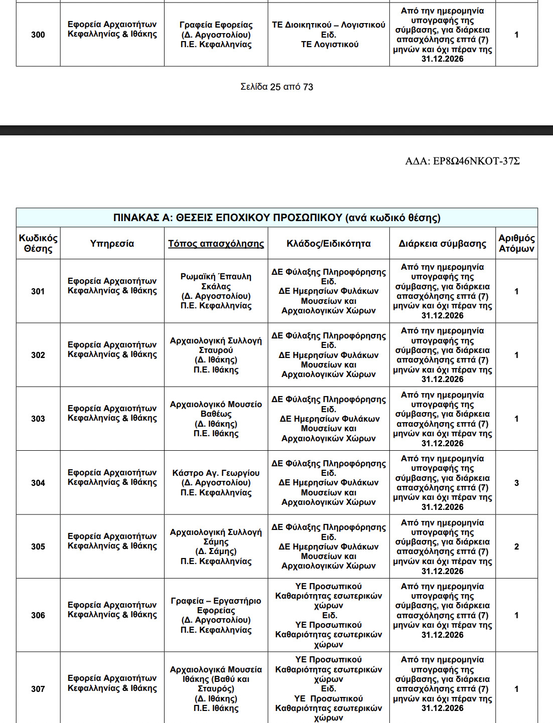 Πρόκειται για συμβάσεις εργασίας ιδιωτικού δικαίου ορισμένου χρόνου, συνολικής διάρκειας επτά (7) μηνών, για την κάλυψη αναγκών στους αρχαιολογικούς χώρους και μουσεία της Εφορείας Αρχαιοτήτων Κεφαλονιάς και Ιθάκης.