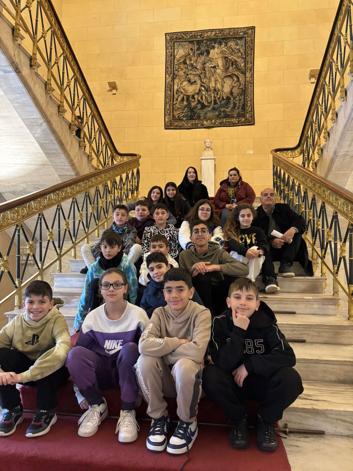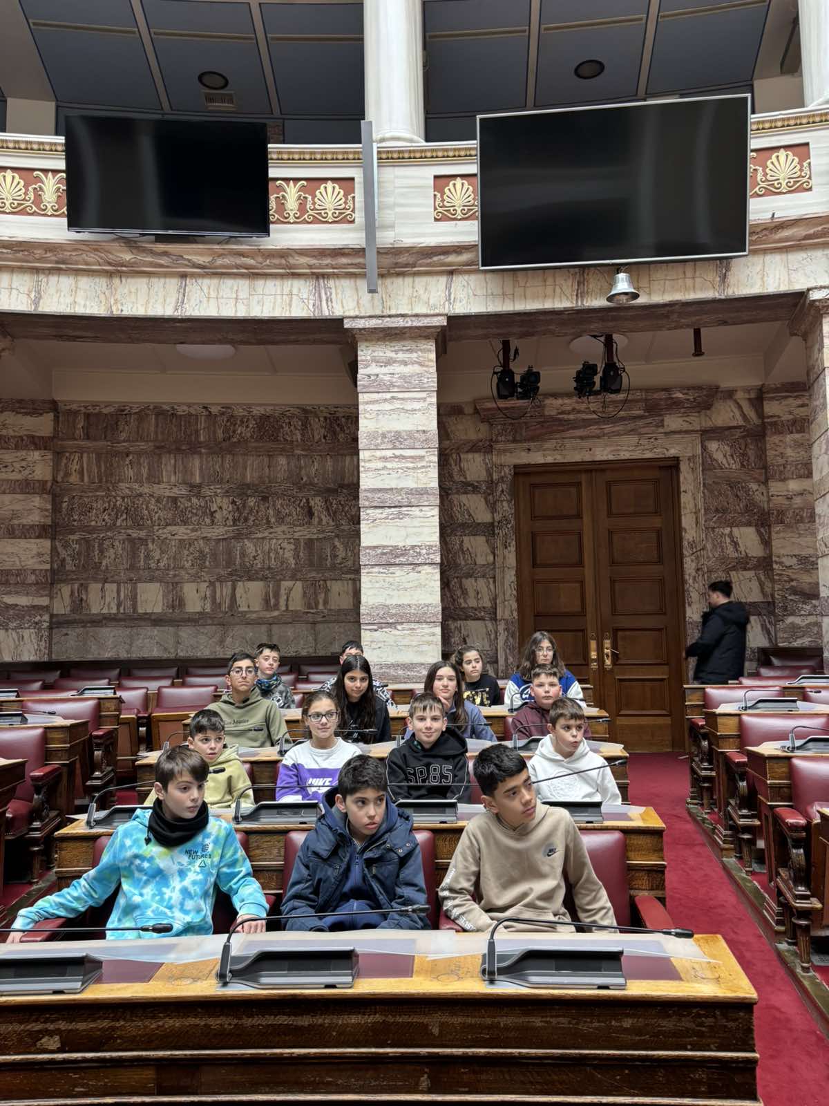 Οι μικροί μας επισκέπτες είχαν την ευκαιρία να καθίσουν στα έδρανα των Βουλευτών στην Αίθουσα της Ολομέλειας, βιώνοντας, έστω και για λίγο, τη σημασία της εκπροσώπησης και της κοινοβουλευτικής διαδικασίας.