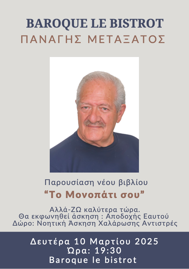 Προσκεκλημένος του Baroque le bistrot με αφορμή την έκδοση του νέου του βιβλίου με τίτλο «Το Μονοπάτι σου» θα είναι τη Δευτέρα 10 Μαρτίου και ώρα 19.30 ο κος Παναγής Μεταξάτος. «Αλλά-ΖΩ καλύτερα τώρα» λέει ο κος Μεταξάτος και επί αυτού θα μιλήσει τη Δευτέρα στο Baroque και θα μοιραστεί με το κοινό τις γνώσεις του.