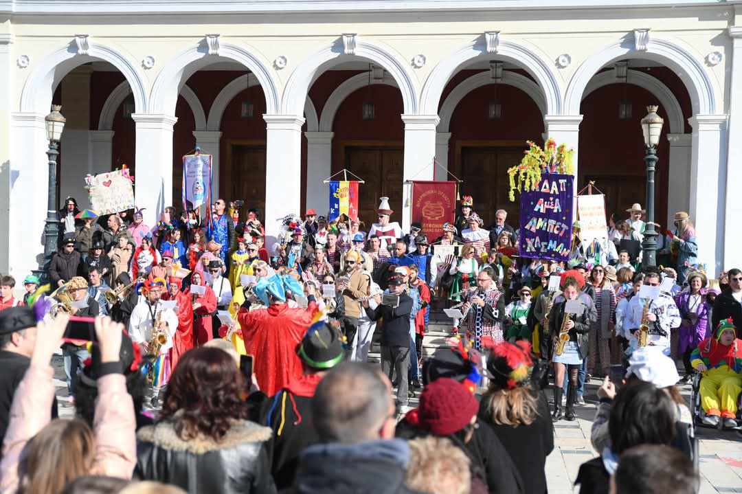 Φτάνοντας στην Πλατεία Γεωργίου Α΄ μπροστά από το Δημοτικό Θέατρο «Απόλλων», ξεσήκωσαν το πολυπληθές κοινό η Δημοτική Μουσική, η Φιλαρμονική Ορχήστρα της Πολυφωνικής με χαρμόσυνους αποκριάτικους ρυθμούς και καρναβαλικούς παιάνες και η Ελεύθερη Ορχήστρα που, ελεύθερη, αυθόρμητη και πολυμελής έδωσε τον καλύτερο εαυτό της με το κεφάτο ρεπερτόριό της.