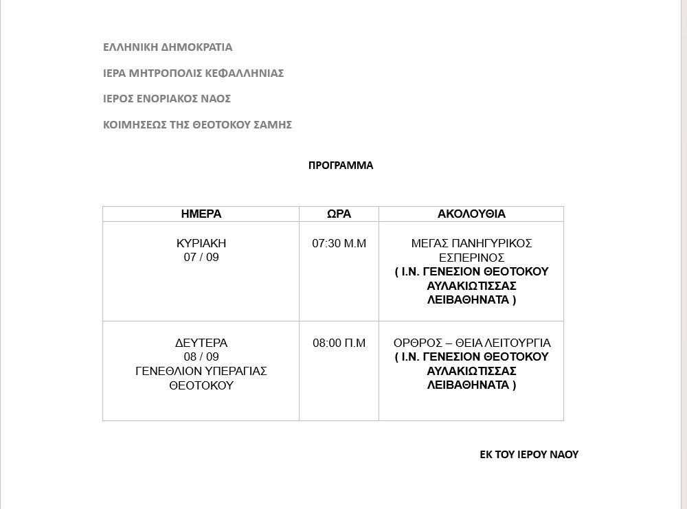 Πρόγραμμα Εορτής Ι.Ν. Γενεσίου Θεοτόκου Αυλακιώτισσας στα Λειβαθηνάτα