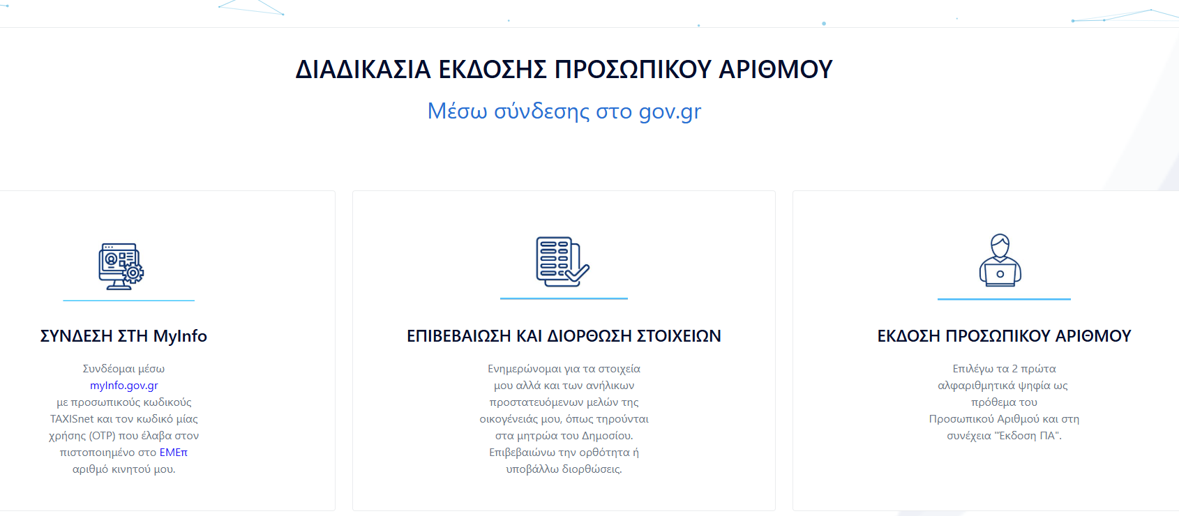 Προκειμένου να εκδώσετε Προσωπικό Αριθμό για το ανήλικο προστατευόμενο μέλος, απαιτείται να έχετε επιβεβαιώσει τα δικά σας στοιχεία μέσω της εφαρμογής myInfo, να επαληθεύεται η σχέση σας με το προστατευόμενο μέλος και το προστατευόμενο μέλος να διαθέτει ΑΦΜ. Εναλλακτικά, μπορείτε να προχωρήσετε στην έκδοση Προσωπικού Αριθμού ανηλίκου με φυσική παρουσία στο ΚΕΠ ή σε έμμισθη Προξενική Αρχή, προσκομίζοντας τα απαιτούμενα δικαιολογητικά.