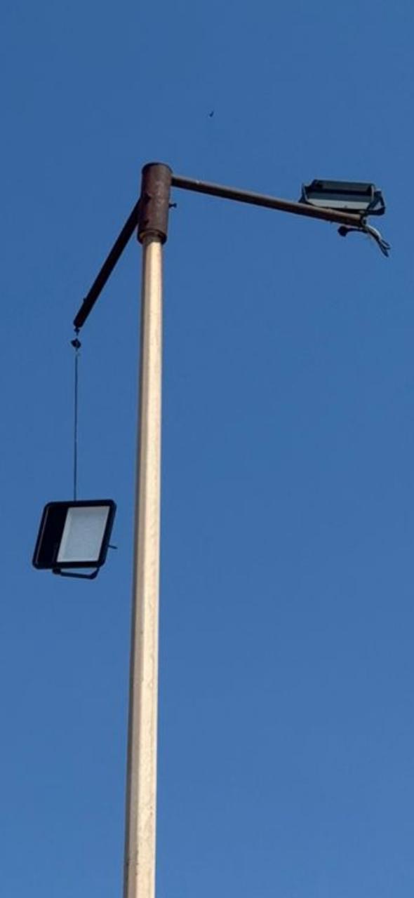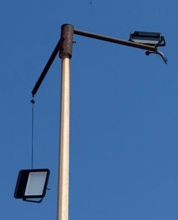 Στις φωτογραφίες που λάβαμε, ένας προβολέας, κρέμεται “χαρωπά” από το καλώδιό του, ακριβώς πάνω από τα κεφάλια ανυποψίαστων τουριστών και ντόπιων.