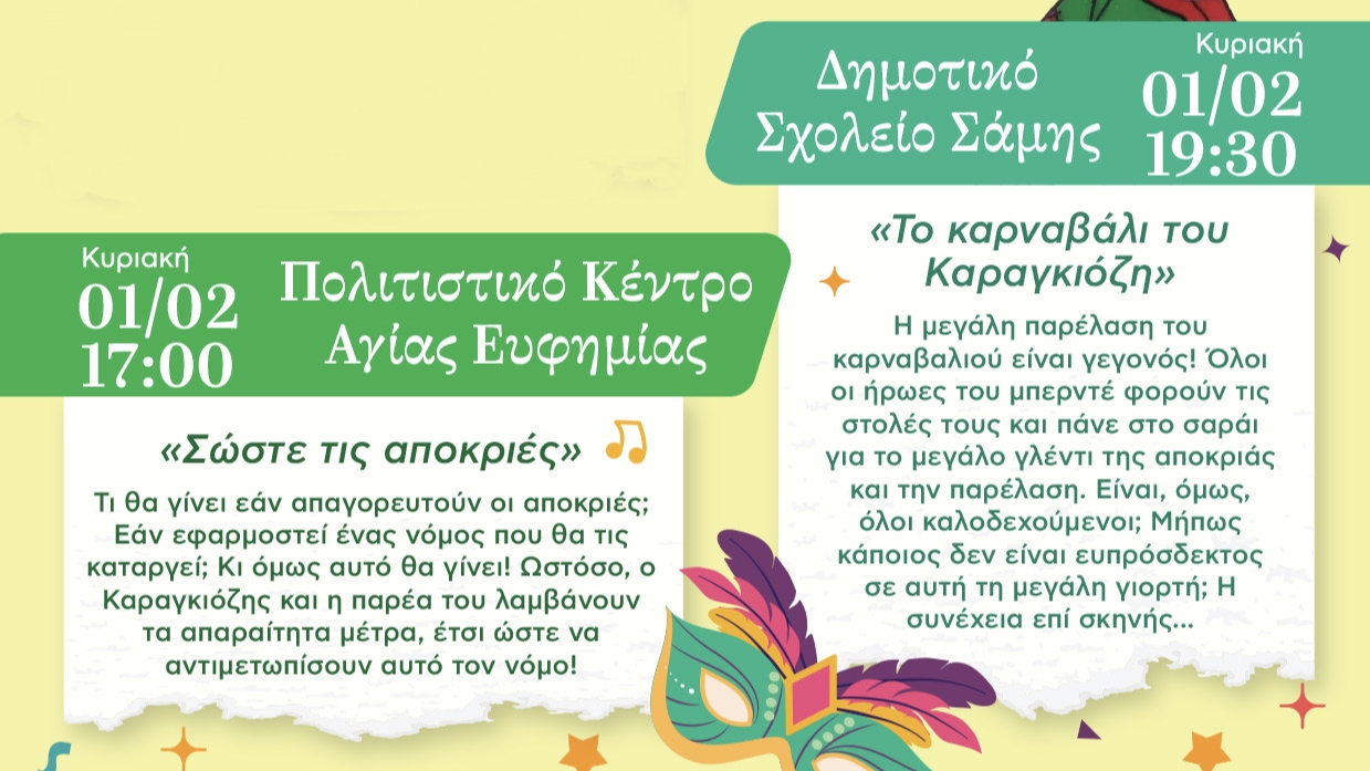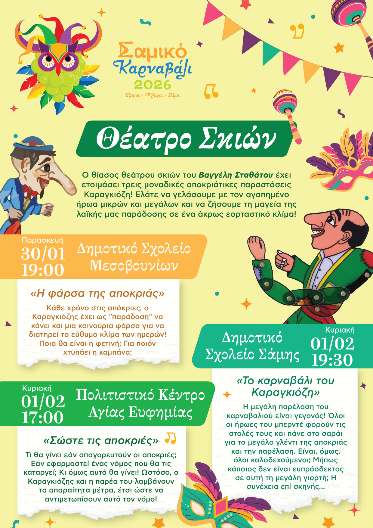 Σαμικό Καρναβάλι: Θέατρο σκιών σήμερα σε Αγία Ευφημία και Σάμη
