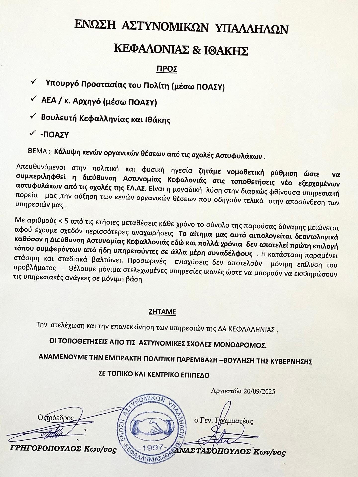 SOS από τους Αστυνομικούς της Κεφαλονιάς: Ζητούν ενίσχυση προσωπικού από τις σχολές