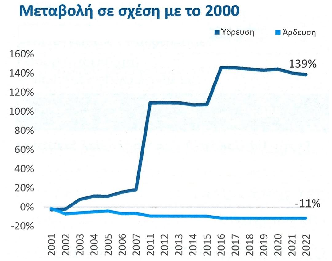 3. Αντιμετωπίζει μείωση διαθεσιμότητας των επιφανειακών πόρων και αύξηση της χρήσης γεωτρήσεων με αποτέλεσμα την υφαλμύριση των υδάτων. Σύμφωνα με τα στοιχεία της ΕΛΣΤΑΤ (https://www.statistics.gr/el/statistics/-/publication/SOP07/-) κατά την περίοδο 2000-2022 η άντληση υπόγειων υδάτων αυξήθηκε κατά 80%, από 3.453 εκατ. κυβικά μέτρα ετησίως σε 6.221. Αντίθετα, η χρήση επιφανειακών υδάτων μειώθηκε κατά 40% (3.852 εκατ. κ.μ. το 2022 έναντι 6.471 εκατ. κ.μ. το 2000). Η σημαντική αύξηση στην άντληση υπόγειων υδάτων, πιέζει τα αποθέματα στον υδροφόρο ορίζοντα και οδηγεί σε υφαλμύριση των υδάτων. Ενδεικτικό είναι, επίσης, ότι παρά τις αυξημένες βροχοπτώσεις των τελευταίων μηνών τα αποθέματα νερού στους ταμιευτήρες των υδροηλεκτρικών της ΔΕΗ βρίσκονται σε ιστορικά χαμηλά επίπεδα. Τα φράγματα της ΔΕΗ χρησιμοποιούνται τόσο για την παραγωγή ενέργειας όσο και για άρδευση/ύδρευση. Έτσι, η μείωση των αποθεμάτων εγκυμονεί κινδύνους όχι μόνο για την επάρκεια νερού αλλά και για το κόστος της ηλεκτρικής ενέργειας.