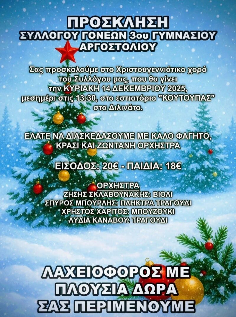Ο Σύλλογος Γονέων και Κηδεμόνων του 3ου Γυμνασίου Αργοστολίου διοργανώνει τον καθιερωμένο χριστουγεννιάτικο χορό του την Κυριακή 14 Δεκεμβρίου 2025, στις 13:30 το μεσημέρι, στο εστιατόριο «Κουτουπάς» στα Διλινάτα.