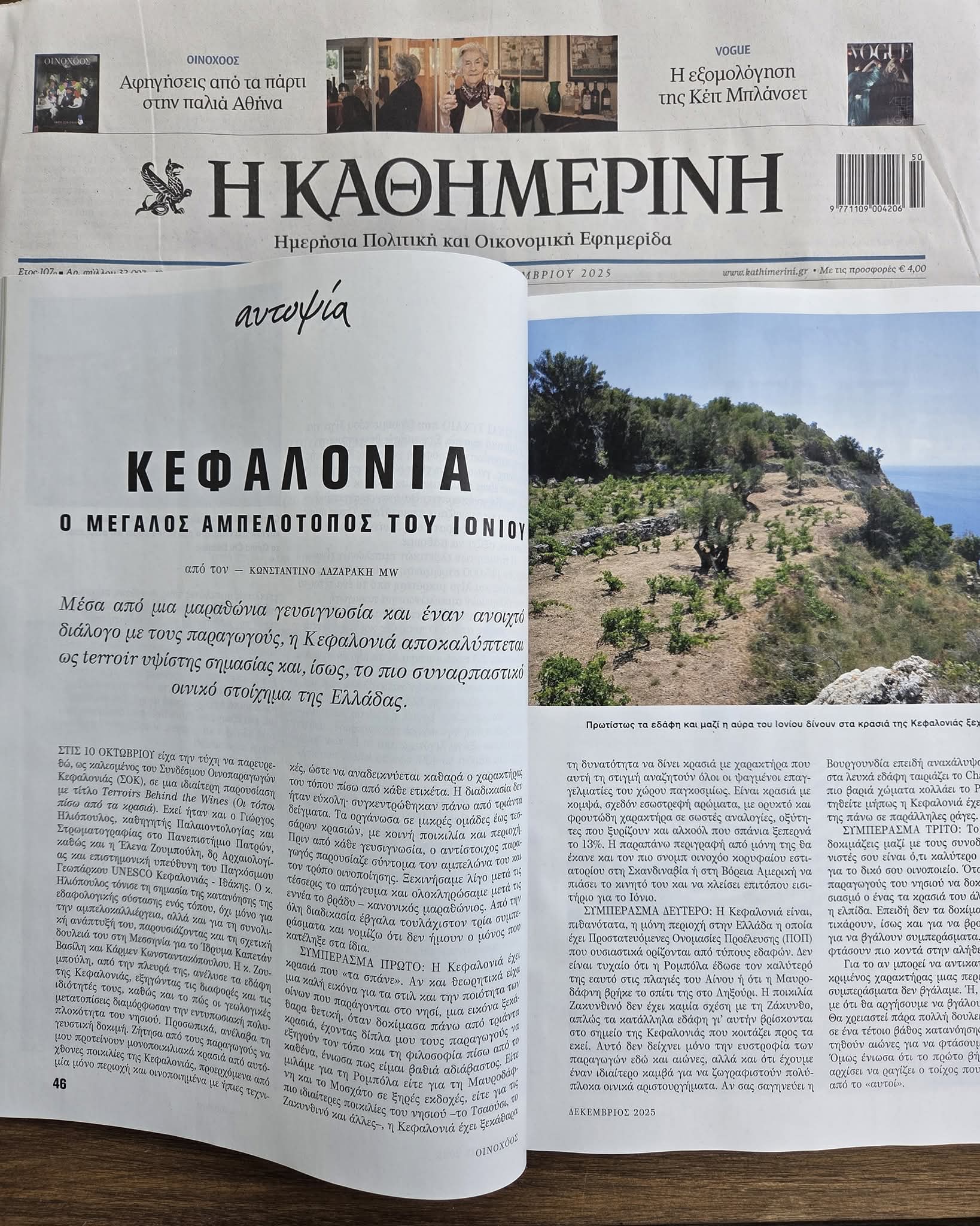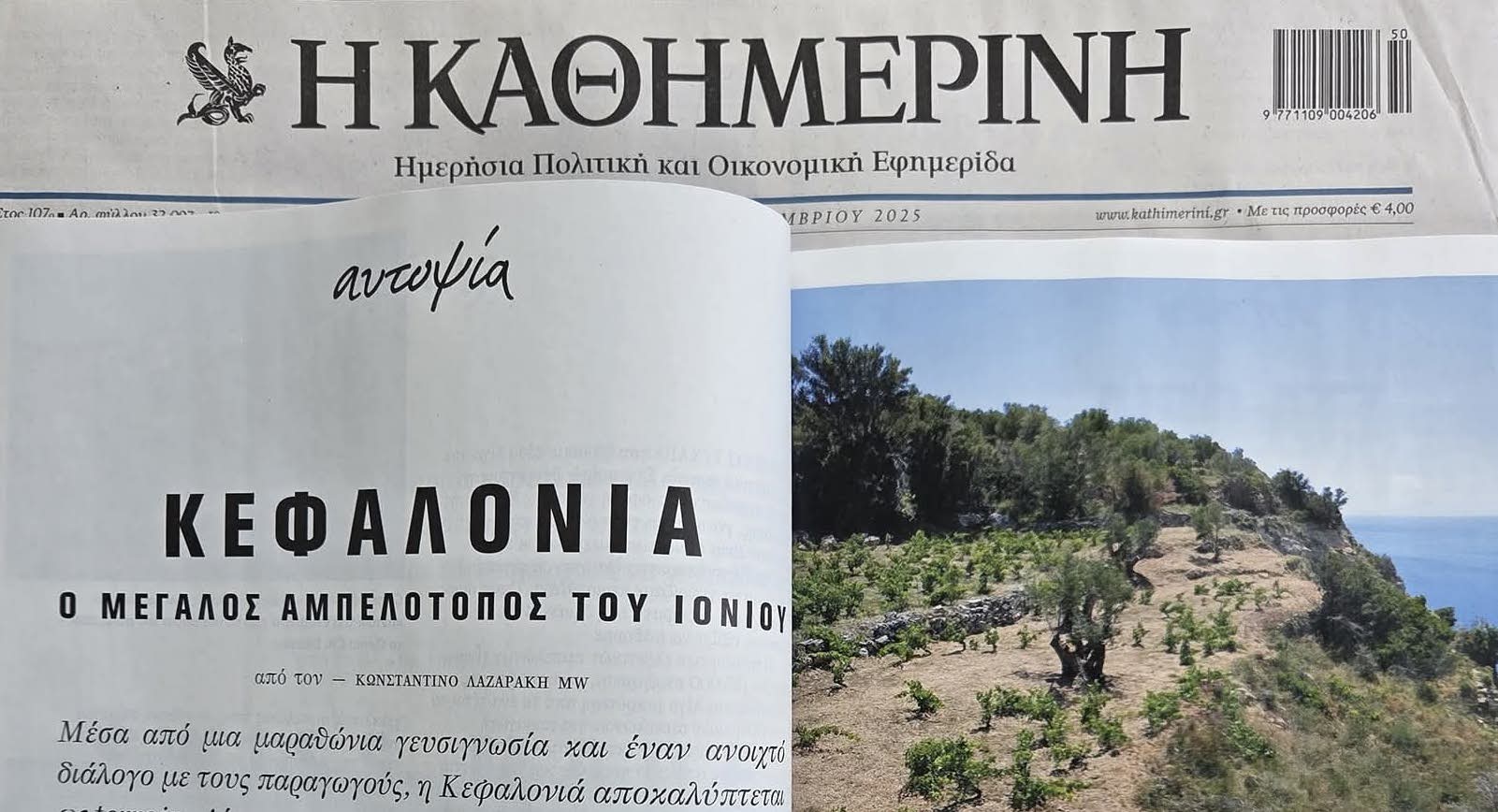 Ο Master of Wine, Κωνσταντίνος Λαζαράκης, γράφει στο κορυφαίο οινικό περιοδικό της Ελλάδας, “Οινοχόος” που κυκλοφορεί με την εφημερίδα Καθημερινή, για τα κρασιά της Κεφαλονιάς και τη δράση του Συνδέσμου Οινοποιών Κεφαλονιάς. Η δράση στην οποία παρευρέθηκε και παρουσίασε ο κ. Λαζαράκης, με τίτλο «Kefalonia: Terroirs behind the wines» ήταν αφιερωμένη στο terroir της Κεφαλονιάς, τα αμπελοτόπια και τα κρασιά του νησιού.