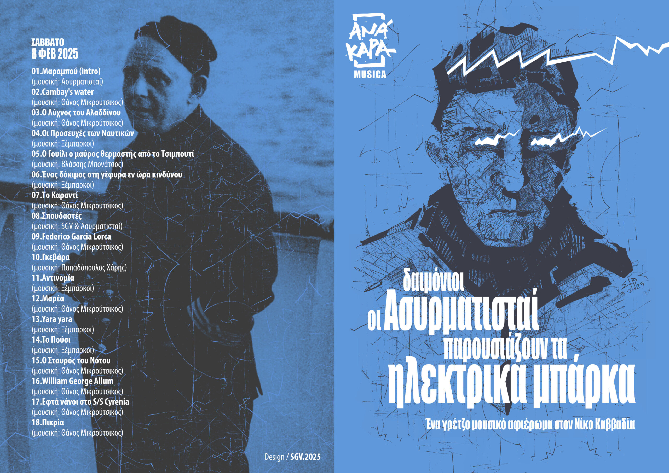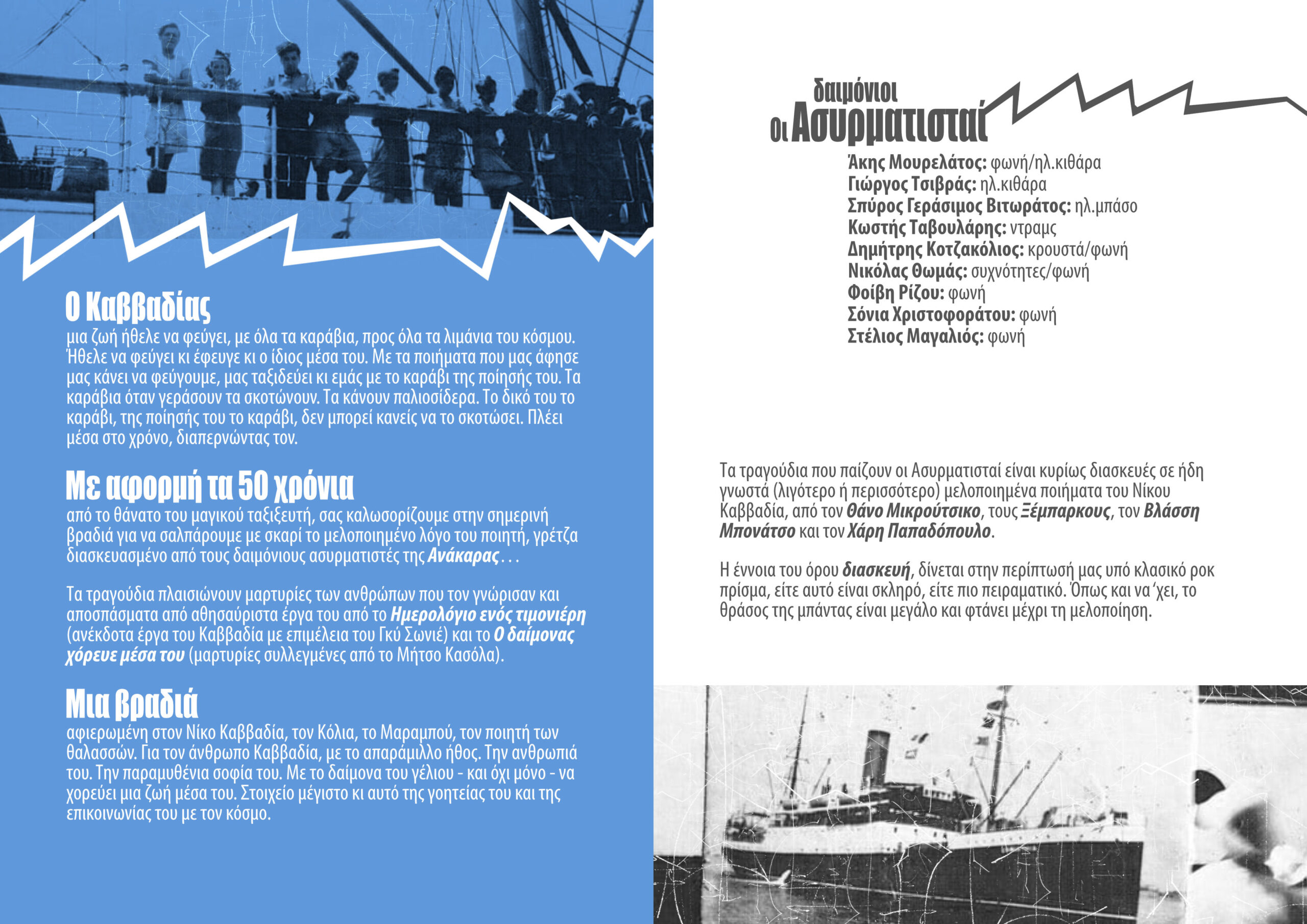 Με αφορμή τα 50 χρόνια από το θάνατο του μαγικού ταξιξευτή Νίκου Καββαδία, σας καλούμε να σαλπάρουμε με σκαρί το μελοποιημένο λόγο του ποιητή, γρέτζα διασκευασμένο από τους δαιμόνιους ασυρματιστές της Ανάκαρας – μια μπάντα που στήθηκε εδώ και 4-5 μήνες, γι’ αυτό ακριβώς το σκοπό. Τα τραγούδια πλαισιώνουν μαρτυρίες των ανθρώπων που τον γνώρισαν και αποσπάσματα από αθησαύριστα έργα του.