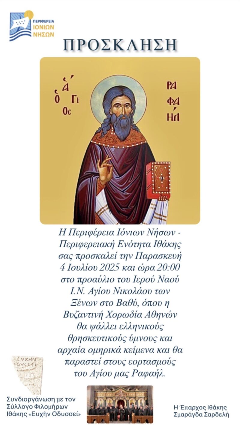 Την Παρασκευή 4 Ιουλίου 2025, στις 8 το απόγευμα, η ΒΥΖΑΝΤΙΝΗ ΧΟΡΩΔΙΑ ΑΘΗΝΩΝ, θα έρθει στην Ιθάκη στο προαύλιο του Αγίου Νικολάου των Ξένων όπου θα ψάλλει Ελληνικούς Θρησκευτικούς Υμνους και Αρχαία Ομηρικά Κείμενα.