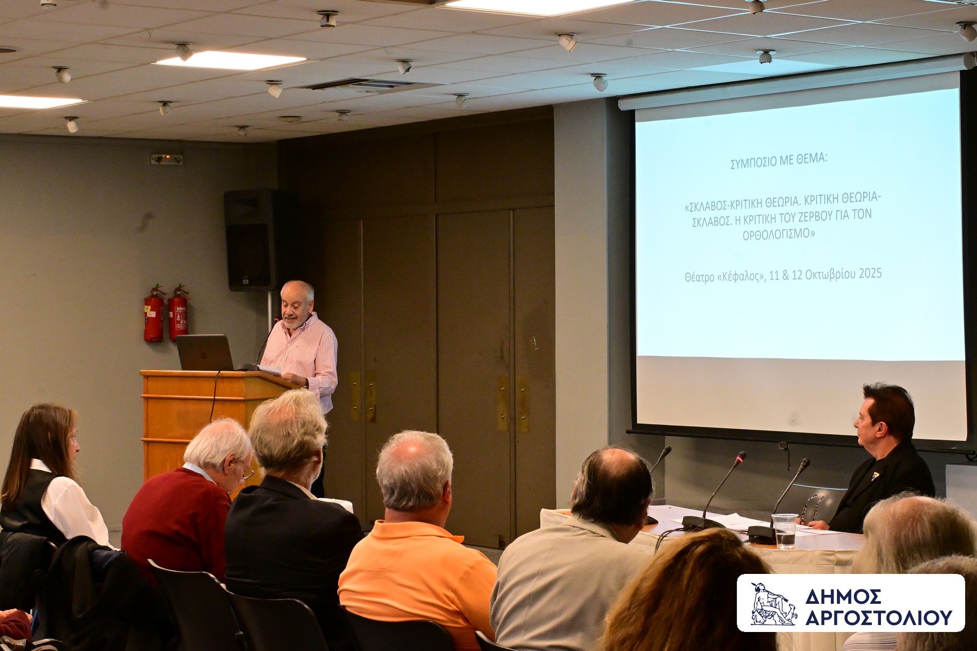 Οι εισηγήσεις ξεκίνησαν με τον κ. Βασίλη Φιοραβάντε, ο οποίος παρουσίασε το θέμα του: «Ο Γεράσιμος Σκλάβος υπό την οπτική της Κριτικής Θεωρίας».