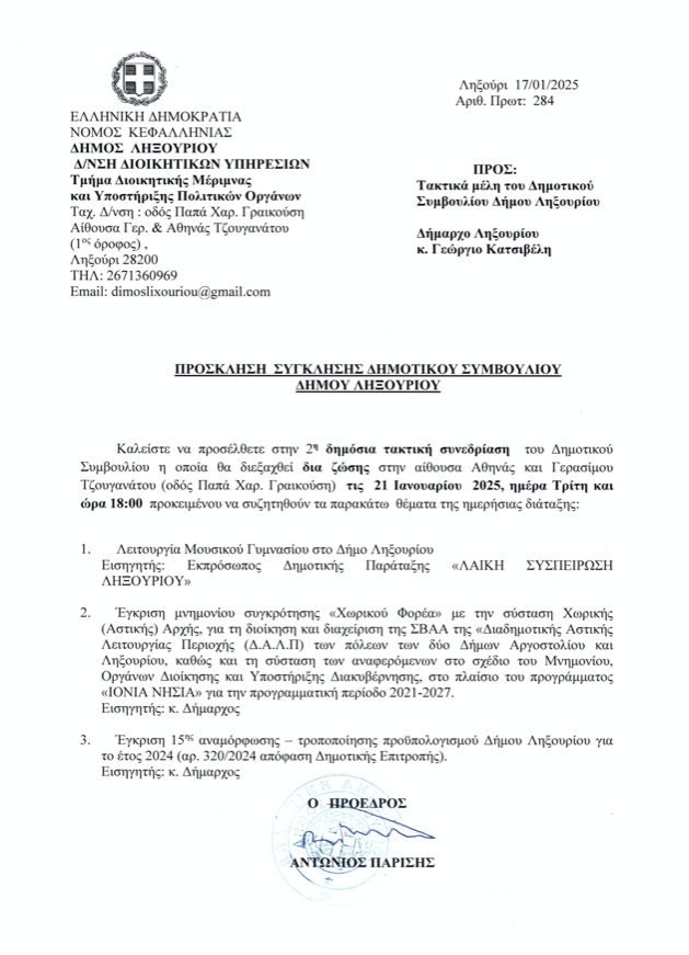 Συνεδριάζει την Τρίτη το Δημοτικό Συμβούλιο Ληξουρίου