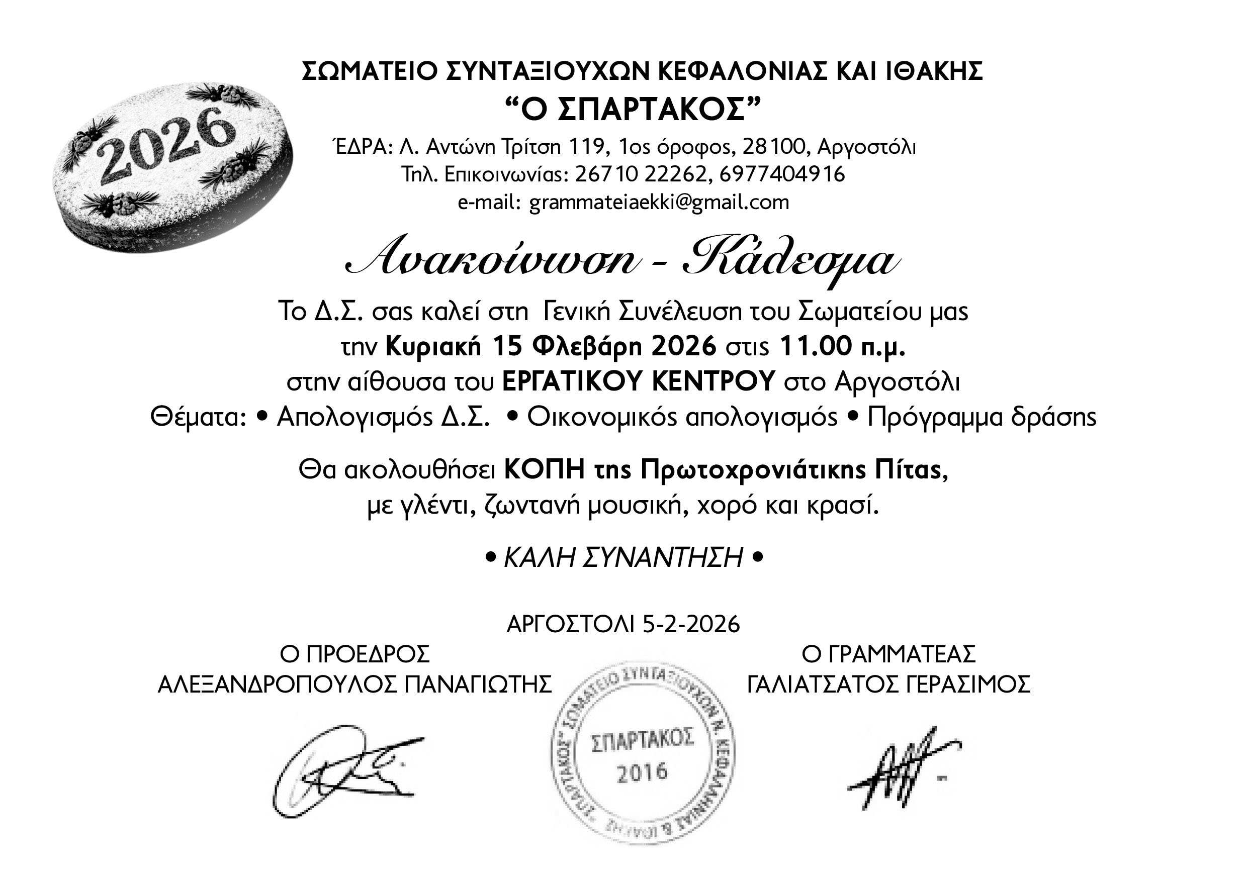 Συνέλευση και κοπή πρωτοχρονιάτικης πίτας του Σωματείου Συνταξιούχων «Ο Σπάρτακος»