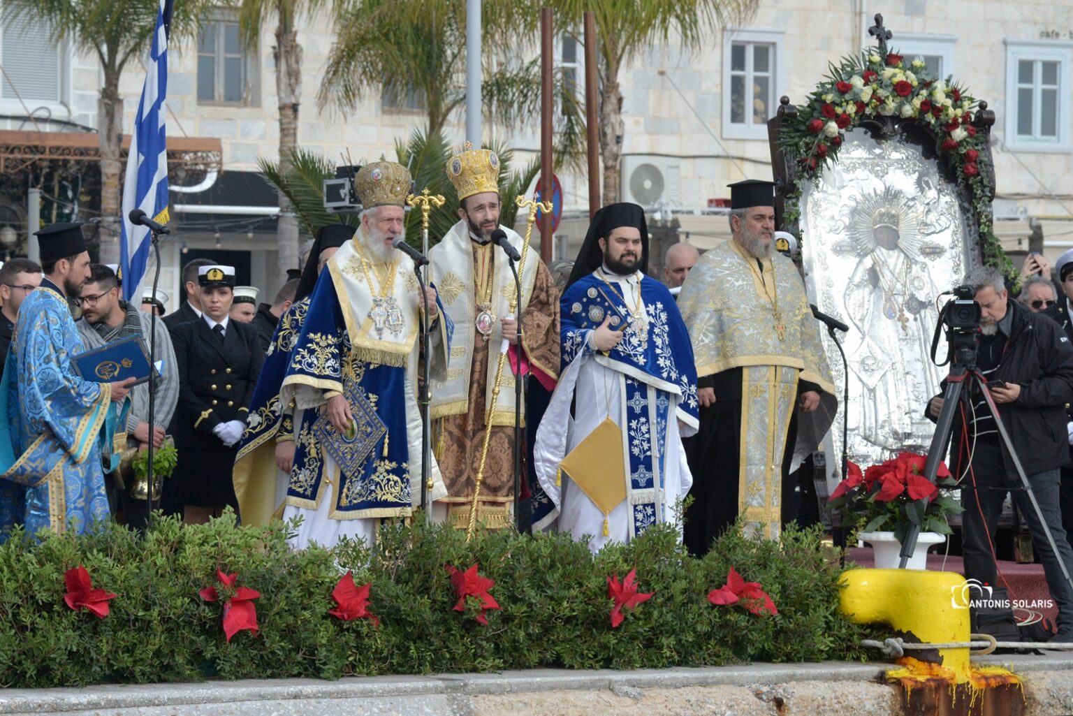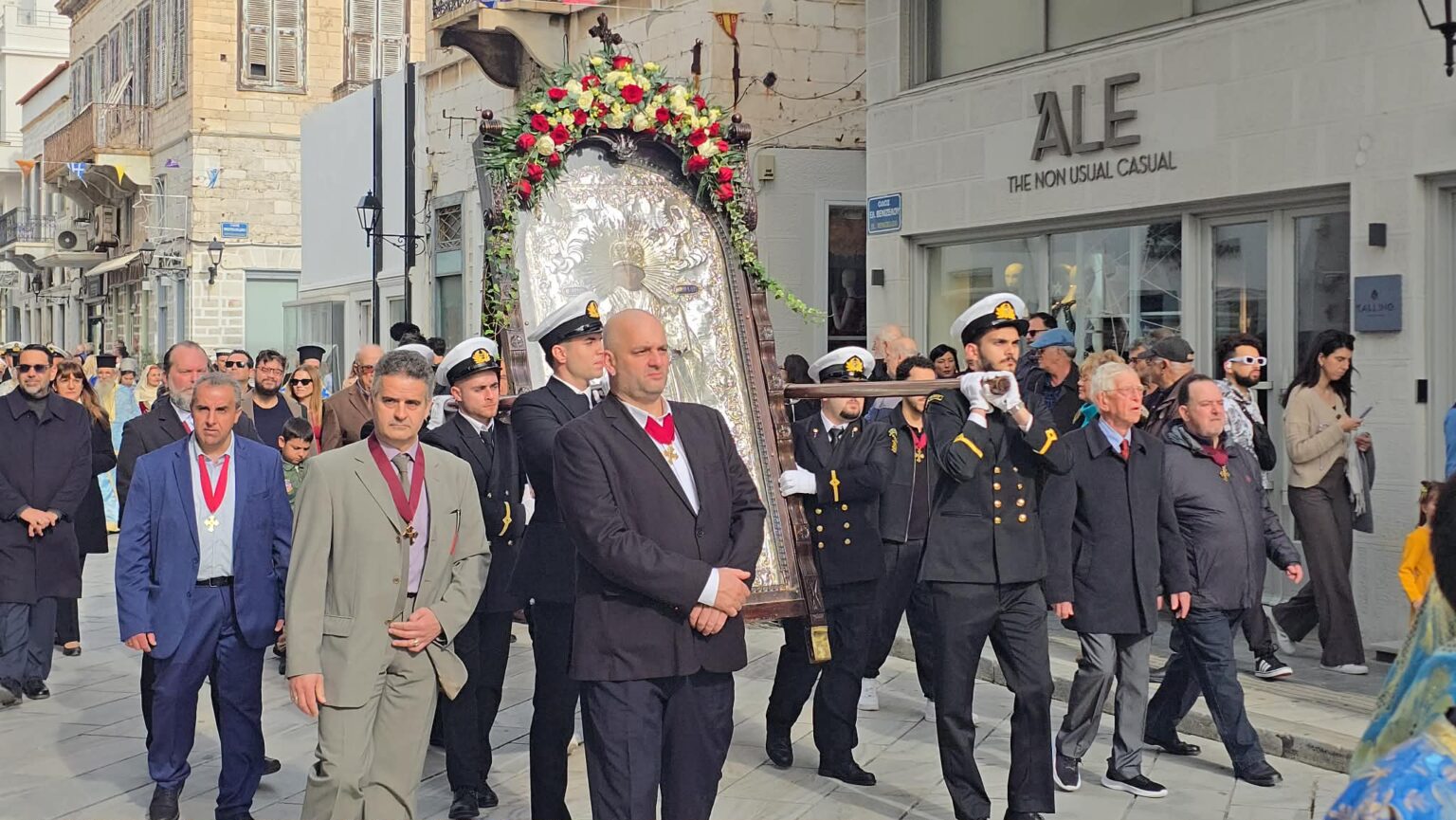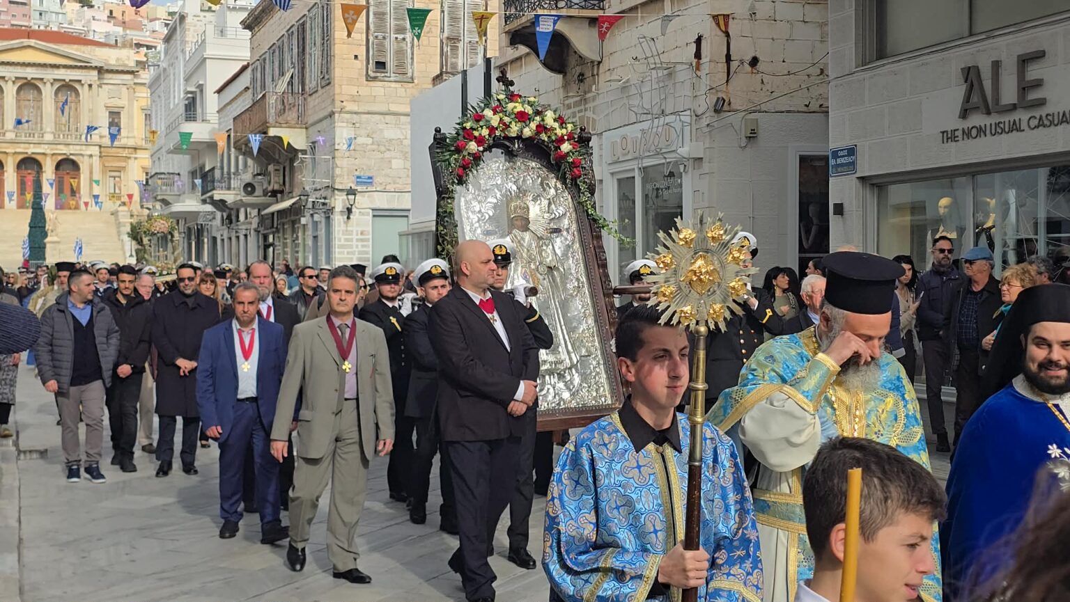 Η Αρχιερατική Θεία Λειτουργία τελέσθηκε στον Μητροπολιτική Ναό Μεταμορφώσεως του Σωτήρος στην Ερμούπολη και ακολούθησε η λιτανευτική πομπή στους δρόμους της Ερμούπολης, την οποία πλαισίωσαν αξιωματικοί και στελέχη του Λιμενικού Σώματος, η Φιλαρμονική του Δήμου Σύρου – Ερμούπολης, το Λύκειο Ελληνίδων Σύρου, το Σώμα Ελλήνων Προσκόπων, οι αρχές του τόπου, εκπρόσωποι της τοπικής αυτοδιοίκησης, συλλογικών φορέων του νησιού και του νομού και αρκετοί πολίτες.