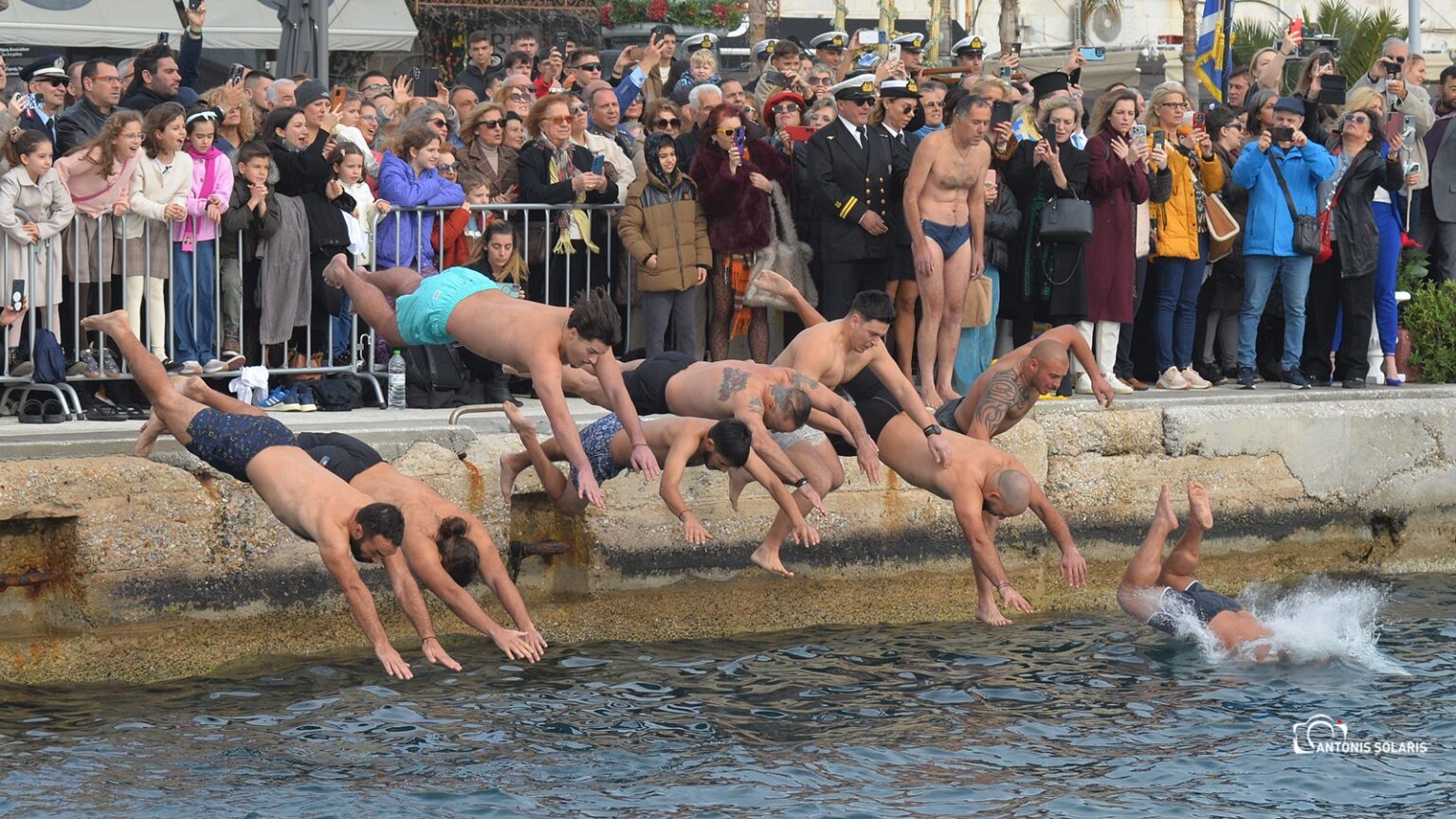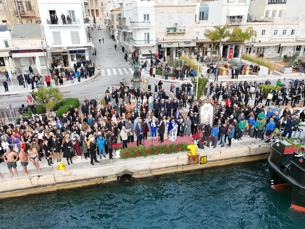 Ο αγιασμός τελέσθηκε από τον Μητροπολίτη Σύρου κ. Δωρόθεο στο λιμάνι της Ερμούπολης, ενώ τον σταυρό ανέσυρε από τη θάλασσα ο νεαρός Βασίλης Κορφιάτης, ο οποίος τον είχε πιάσει και πέρυσι, ακριβώς πριν ένα χρόνο. Αξίζει να σημειωθεί ότι ανάμεσα στους τολμηρούς που έπεσαν στα παγωμένα νερά, ήταν και ένα μικρό παιδί μόλις 5 ετών. Ίσως ήταν ο μικρότερος σε ηλικία κολυμβητής σε όλη την Ελλάδα που συμμετείχε στον αγιασμό των υδάτων.