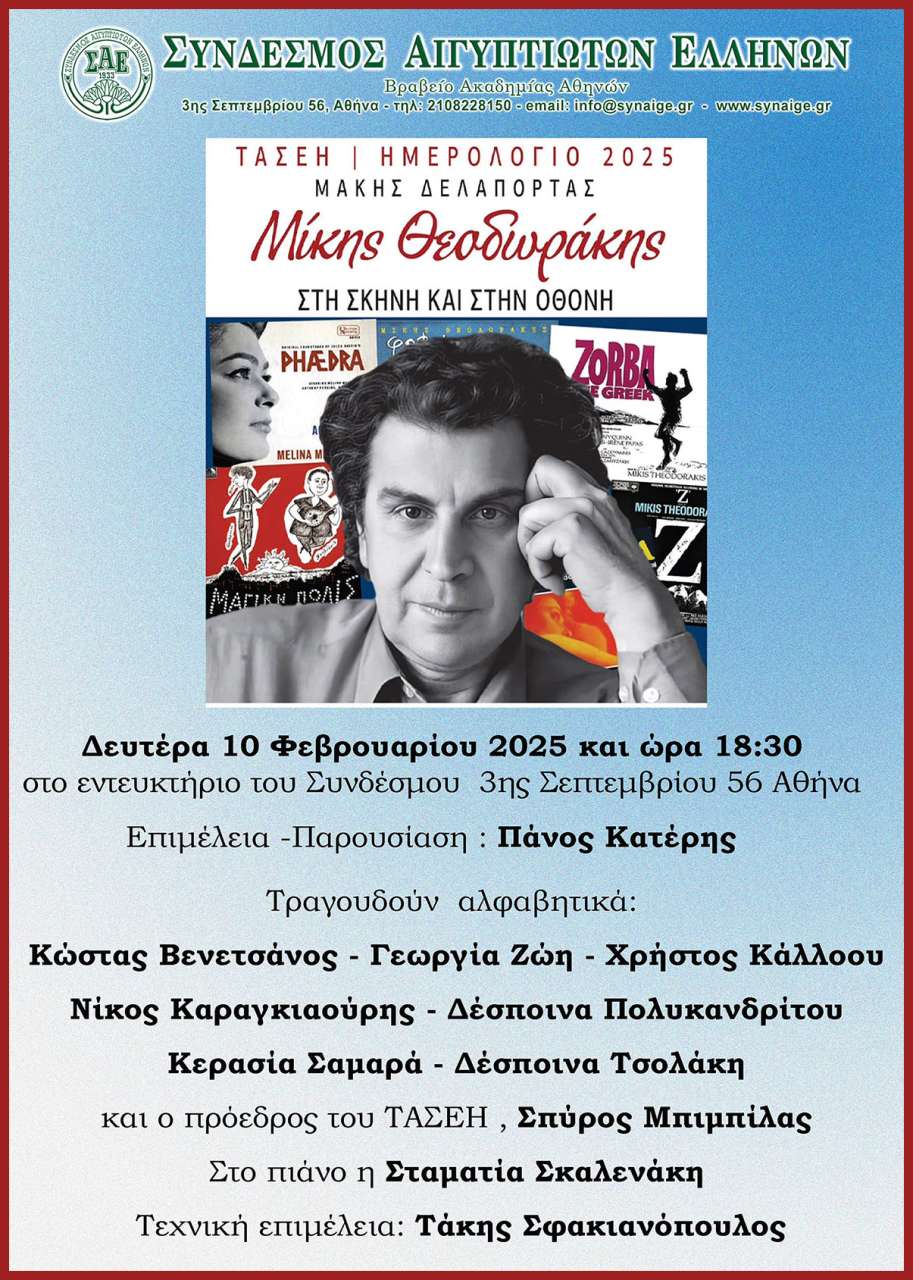 Τη Δευτέρα 10 Οκτωβρίου και ώρα 18:30 στο εντευκτήριο του Συνδέσμου στην οδό 3ης Σεπτεμβρίου 56 στην Αθήνα, θα πραγματοποιηθεί η τιμητική εκδήλωση του Συνδέσμου Αιγυπτιωτών Ελλήνων για τα 100 χρόνια από τη γέννηση του Μίκη Θεοδωράκη.