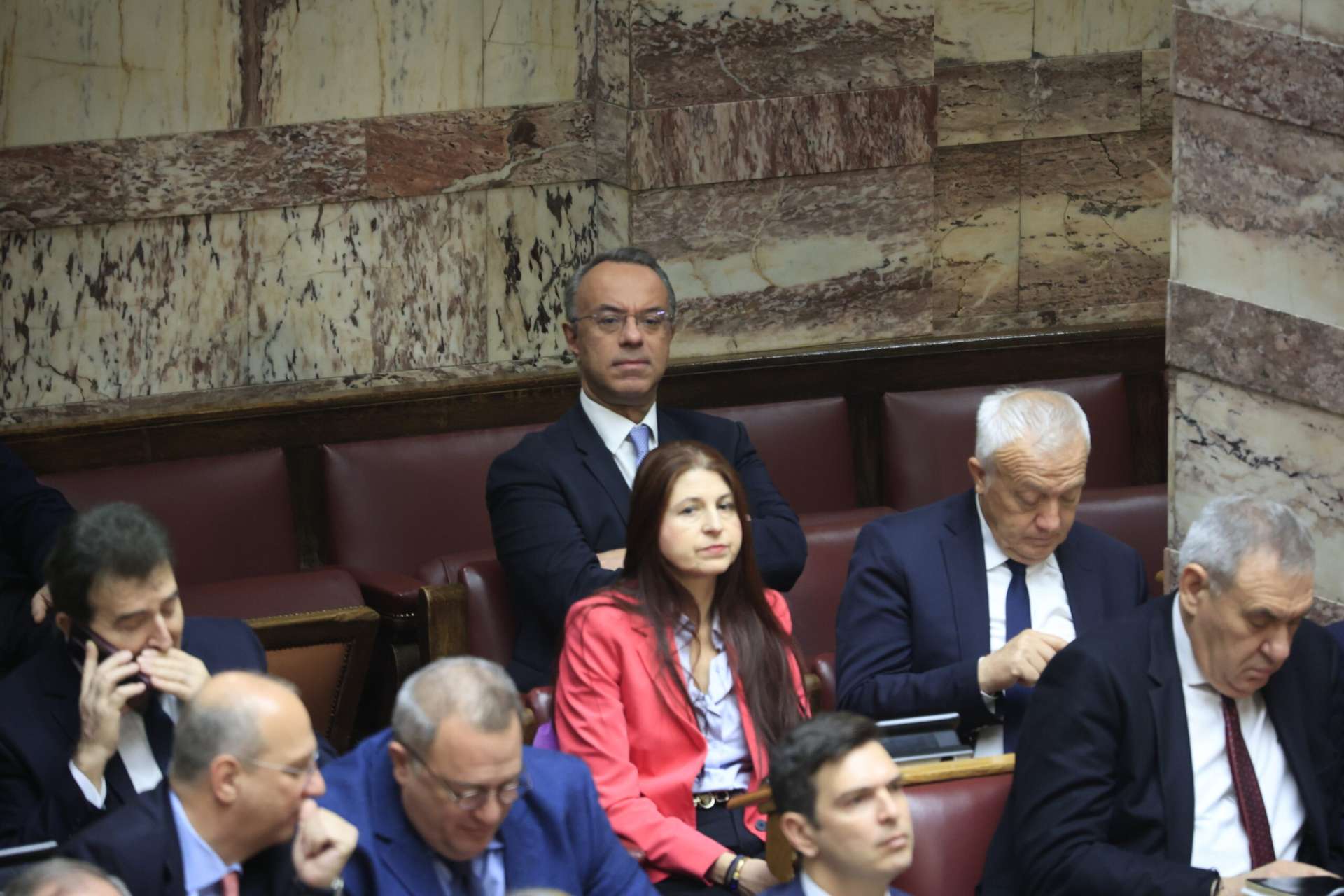 Στα υπουργικά έδρανα, κάθισαν κατά σειρά οι υπουργοί, Εθνικής Οικονομίας Κωστής Χατζηδάκης, Εργασίας Νίκη Κεραμέως, Αγροτικής Ανάπτυξης Κώστας Τσιάρας, Κλιματικής Κρίσης Βασίλης Κικίλιας, Υγείας Άδωνις Γεωργιάδης, Κοινωνικής Συνοχής και Οικογένειας Σοφία Ζαχαράκη και Επικρατείας Μάκης Βορίδης.
