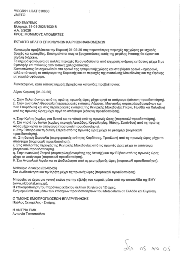 1. Σε εκτέλεση ανωτέρω σχετικής αναδιαβιβάζεται συνημμένα το δελτίο πρόγνωσης καιρού της Ε.Μ.Υ./ Ε.Μ.Κ. 31-01-2026/ 10:30 τοπική, που αφορά θαλάσσια περιοχή δικαιοδοσίας μας και παρακαλούμε για την ενημέρωσή σας.