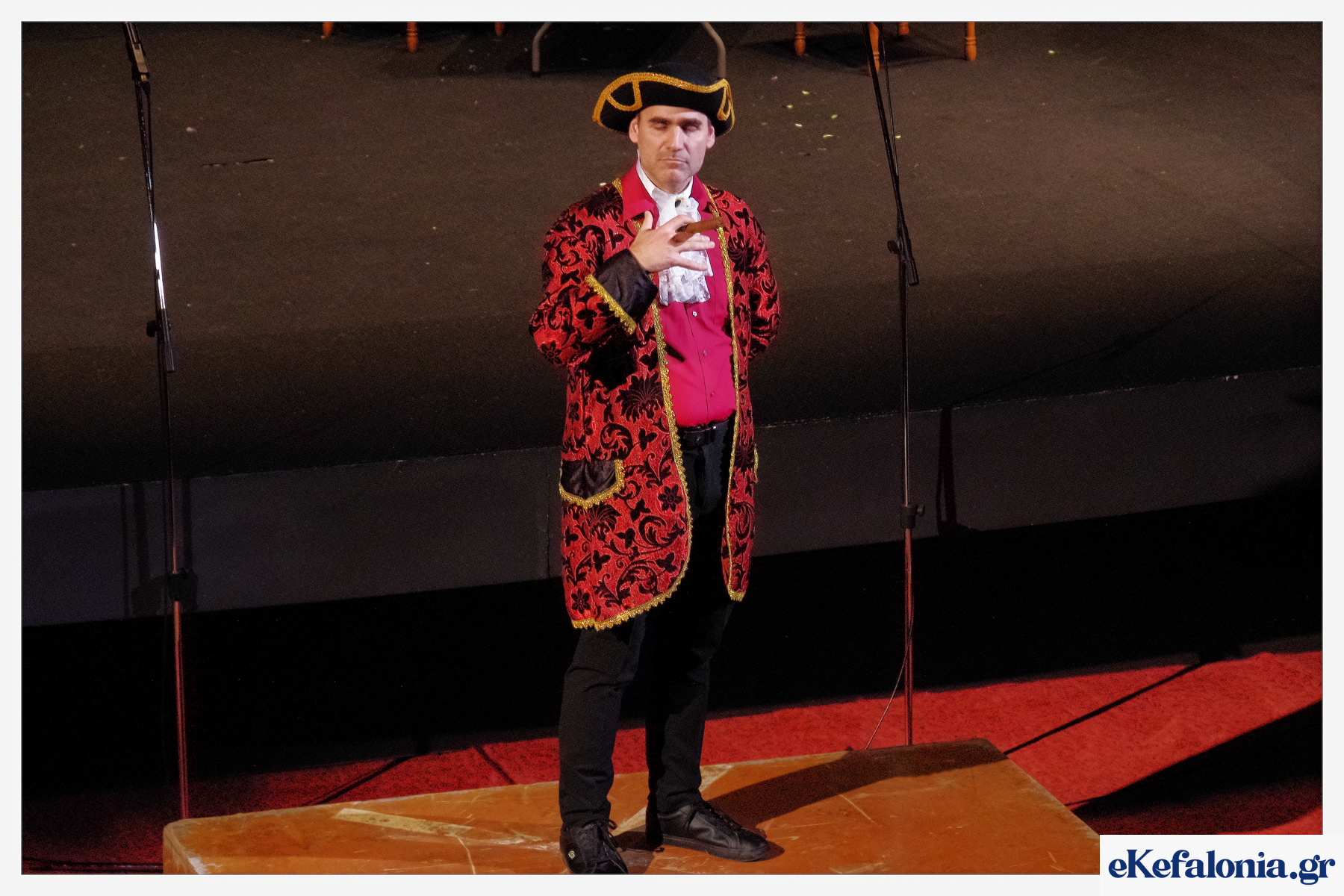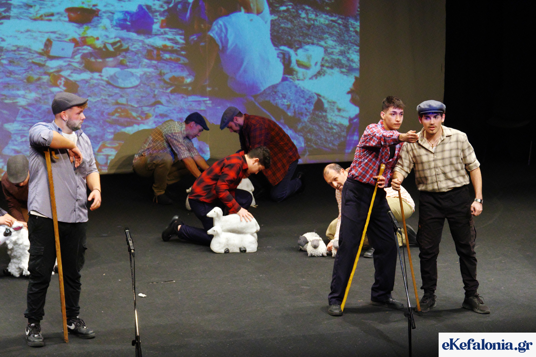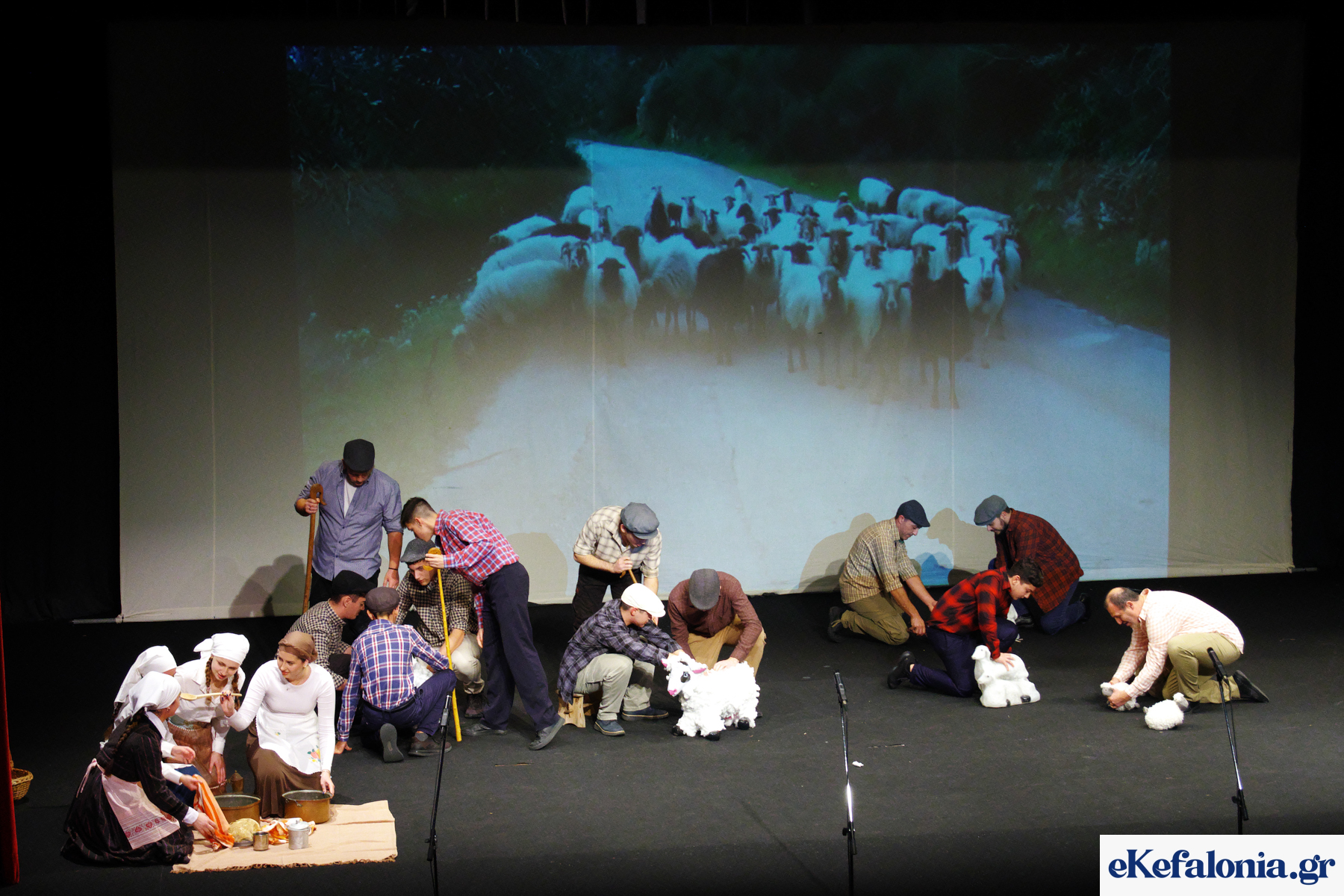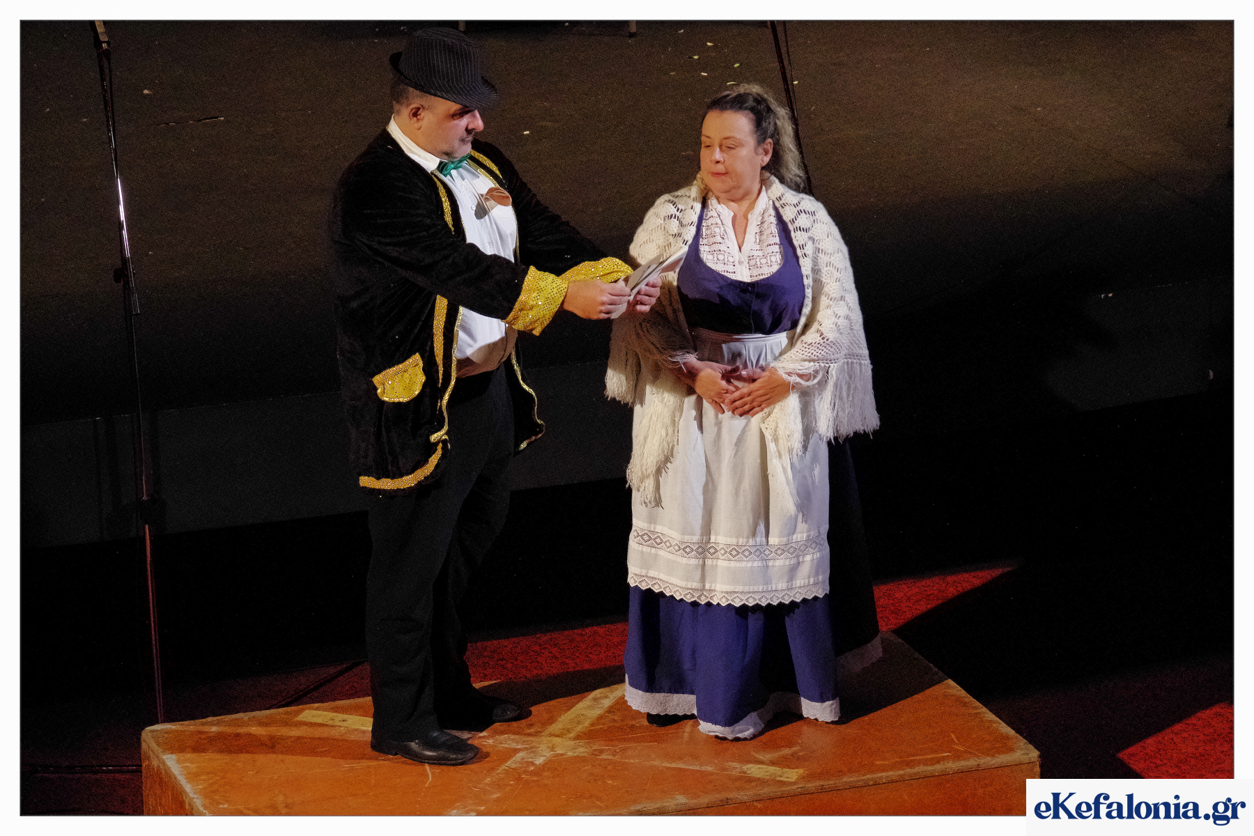 Η παράσταση, δομημένη σε δύο διακριτά αλλά απολύτως συμπληρωματικά μέρη, λειτούργησε ως μια σκηνική τοιχογραφία: από την αγροτική καθημερινότητα και τα τελετουργικά της υπαίθρου, έως την αστική ζωή, τις κοινωνικές αντιφάσεις και το καυστικό χιούμορ της κεφαλονίτικης ιδιοσυγκρασίας.