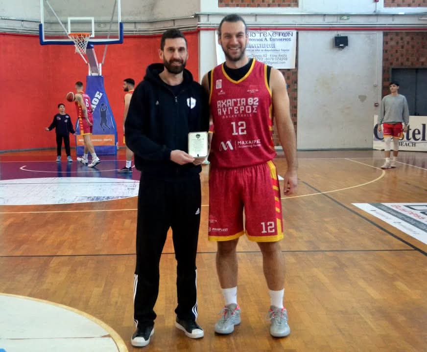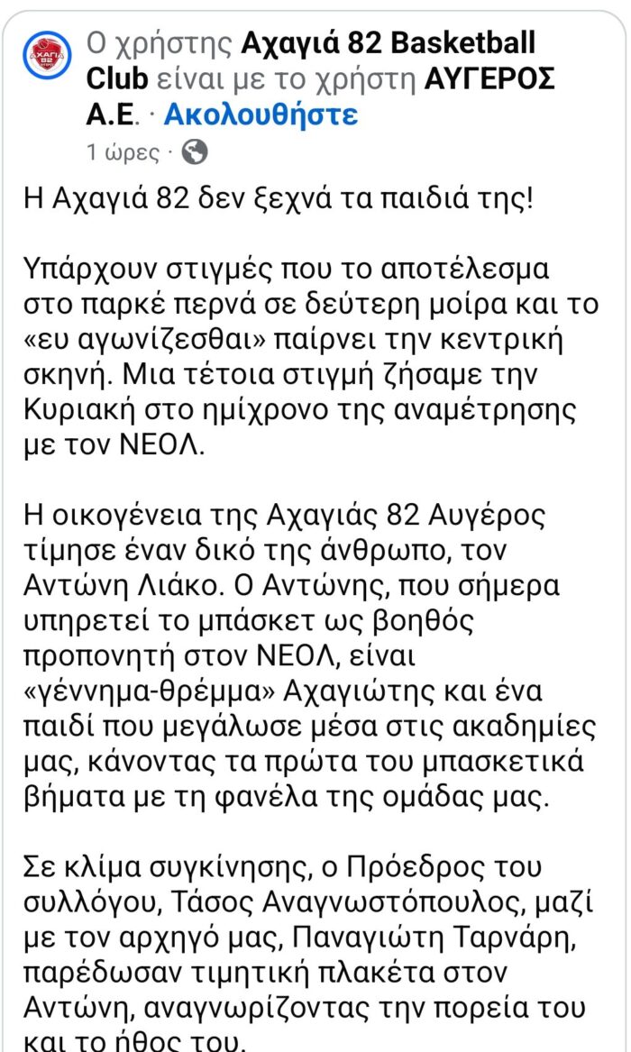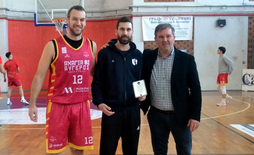 Τιμητική πλακέτα για την προσφορά του στο μπάσκετ και στην ομάδα απένειμε η Αχαγιά 82 ΑΥΓΕΡΟΣ στον βοηθό προπονητή του ΝΕΟΛ, Αντώνη Λιάκο.