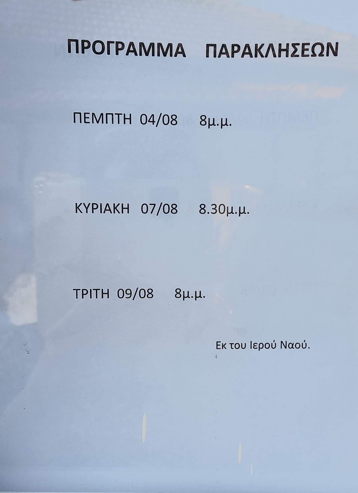 – Παρασκευή 4/08/23 στις 20:00 Θα τελεστεί Παράκληση.