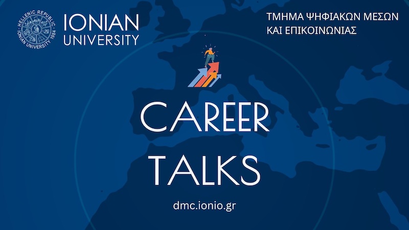 Το Τμήμα Ψηφιακών Μέσων και Επικοινωνίας του Ιονίου Πανεπιστημίου διοργανώνει για 4η συνεχή χρονιά “Ημέρα Καριέρας” (Career Talks) τη Δευτέρα, 17 Φεβρουαρίου 2025 στις 18:00 στο Αμφιθέατρο «Γεράσιμος Αρσένης» του Τμήματος Ψηφιακών Μέσων και Επικοινωνίας (Αντ. Τρίτση 1, Αργοστόλι).