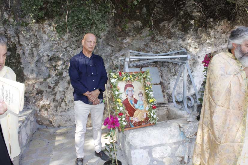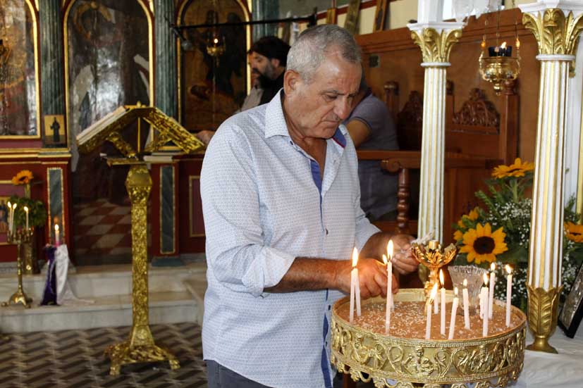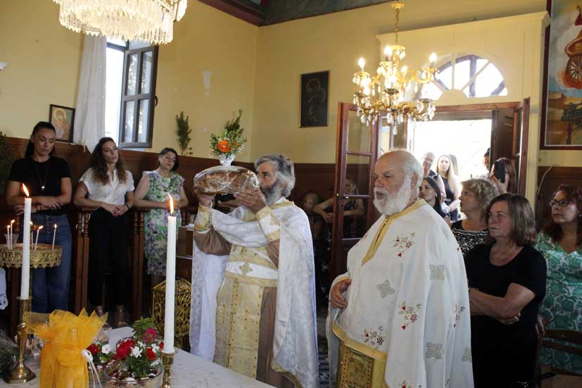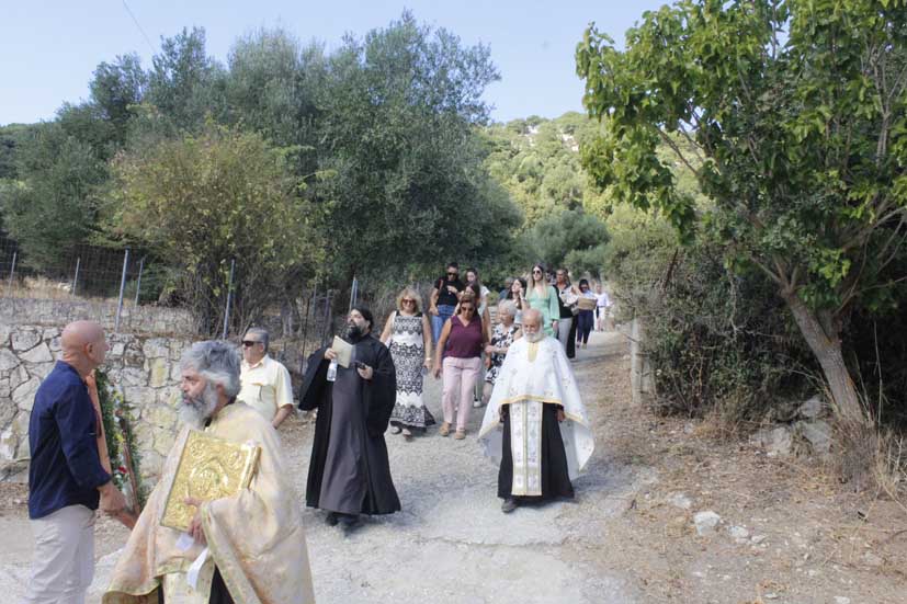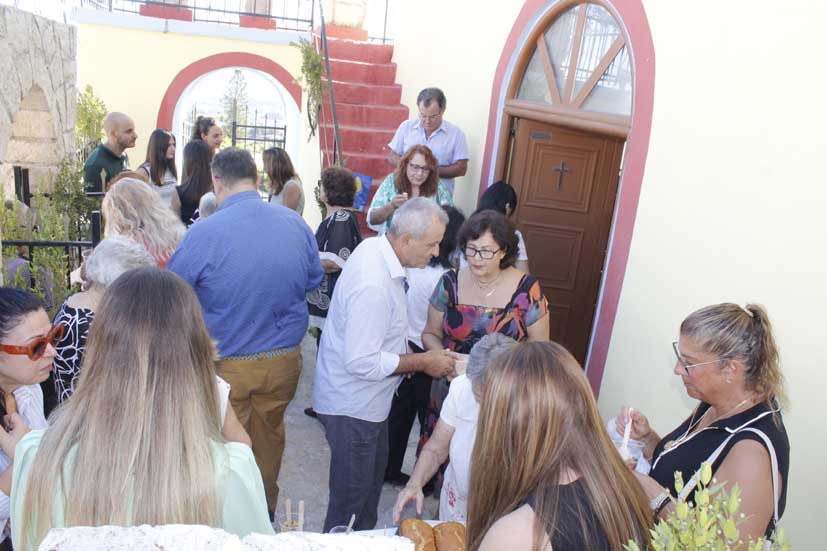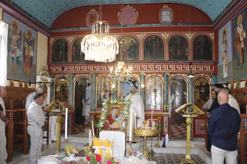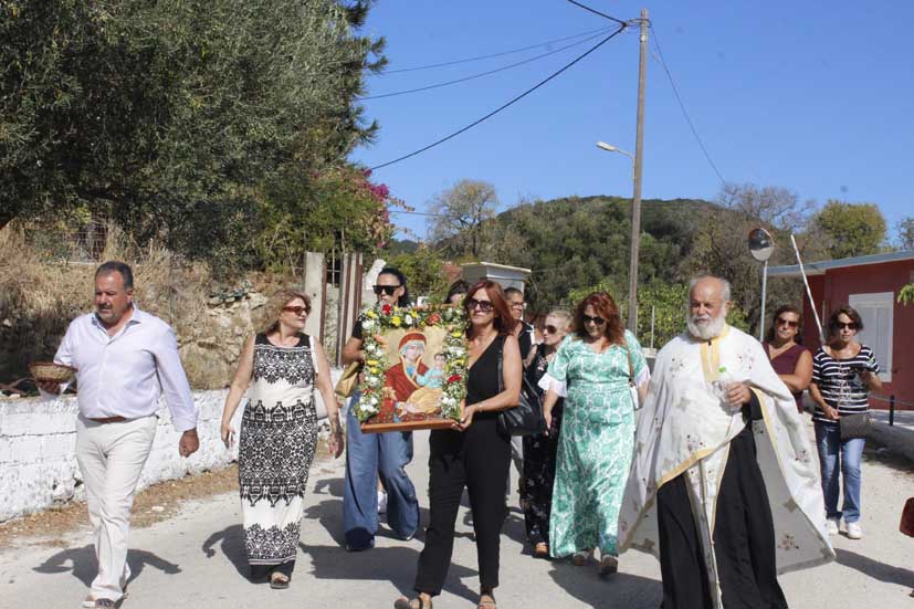 Βρεθήκαμε πολλοί στο εκκλησίασμα που έγινε με πολλή ευλάβεια και σεβασμό προς την Θεοτόκο. Ο π. Γεράσιμος Σφαέλος κατά το τέλος της Θείας Λειτουργίας, είπε δυο λόγια εγκάρδια για την εορτή της Παναγίας. Μετά την ευλόγηση των άρτων κινήσαμε για τη λιτανεία της εικόνας, περπατώντας σε χωμάτινη στράτα, που οι πέτρες ανάρια -ανάρια ήταν ριγμένες, σαν πινελιές πάνω σε γκρίζο χωμάτινο καμβά. Με συνοδεία τις παλιές ελιές η λιτανική πομπή έφτασε και στο πηγάδι του Κοσμά του Αιτωλού. Ένα βαθούλωμα στο βράχο γεμάτο εικόνες κι ένα καντήλι, μνημονεύει το πέρασμα από κει του Ισαποστόλου και Δασκάλου Πατροκοσμά. Έγινε στάση για δέηση στο σημείο κι έπειτα μπήκαμε στο ξωκλήσι της Αγίας Παρασκευής, που εξ ολοκλήρου φτιάχνεται, από τον π. Αθανάσιο Λυκούδη σε ανάμνηση της πολύ παλιάς εκκλησίας της Αγίας Παρασκευής στους Αγκασιανούς, όπως λέγεται η περιοχή. Η παλιά εκκλησία αναφέρεται από το 1718, ήταν ιδιωτική του ιερέα Παύλου Λυκούδη και μνημονεύεται αυτή τη χρονιά στη διαθήκη του.