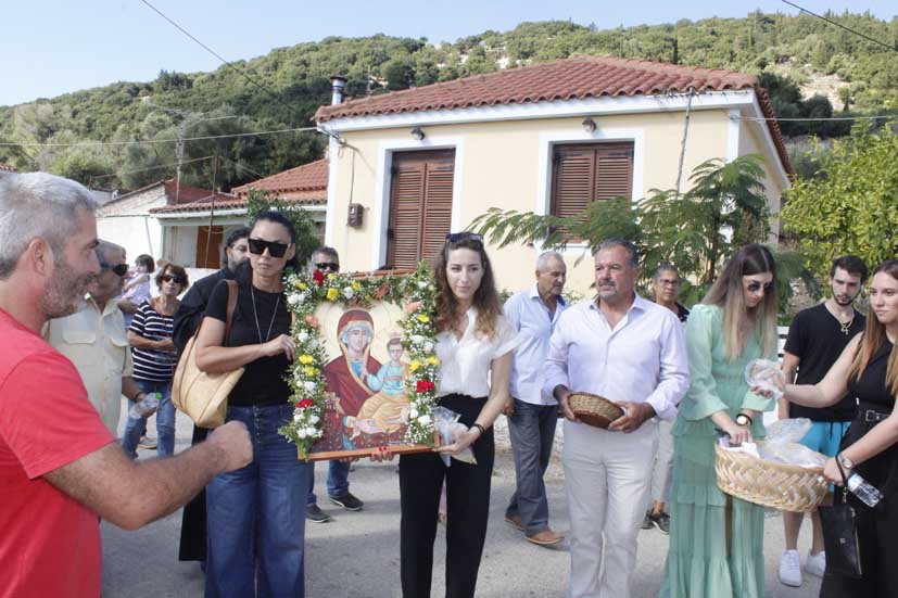 Από εκεί συνεχίσαμε τη στράτα και γυρίσαμε το χωριό, πόρτα- πόρτα και αυλή – αυλή, όπου μας περίμεναν οι κάτοικοι για να γίνει η στάση- δέηση για τα καλό του νοικοκυριού τους. Εκφράσεις πίστης και χαράς, ευλάβεια και σεβασμό στην Παναγία του χωριού, όπου δεν έλειψαν μέσα στα πολλά και όμορφα της ψυχής και τα νικητήρια άνθη στρωμένα στο δρόμο για να περάσει η εικόνα. Καταλήξαμε όλοι στο σπίτι, το πατρικό της Θεανώ Τζουγανάτου, ιερείς, ψαλτάδες, και κόσμος όπου προσφέρθηκαν γλυκά και κεράσματα, καφέδες και αναψυκτικά, πλούσια στην προσφορά των χεριών, του χαμόγελου και της καλής καρδιάς!