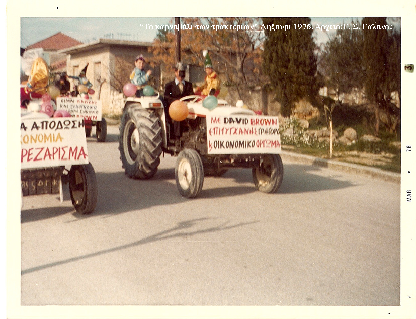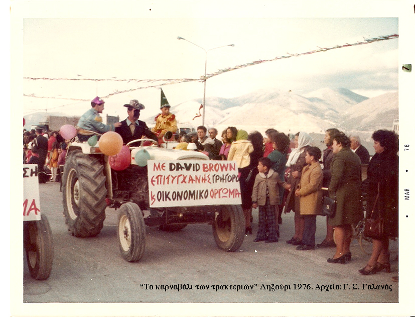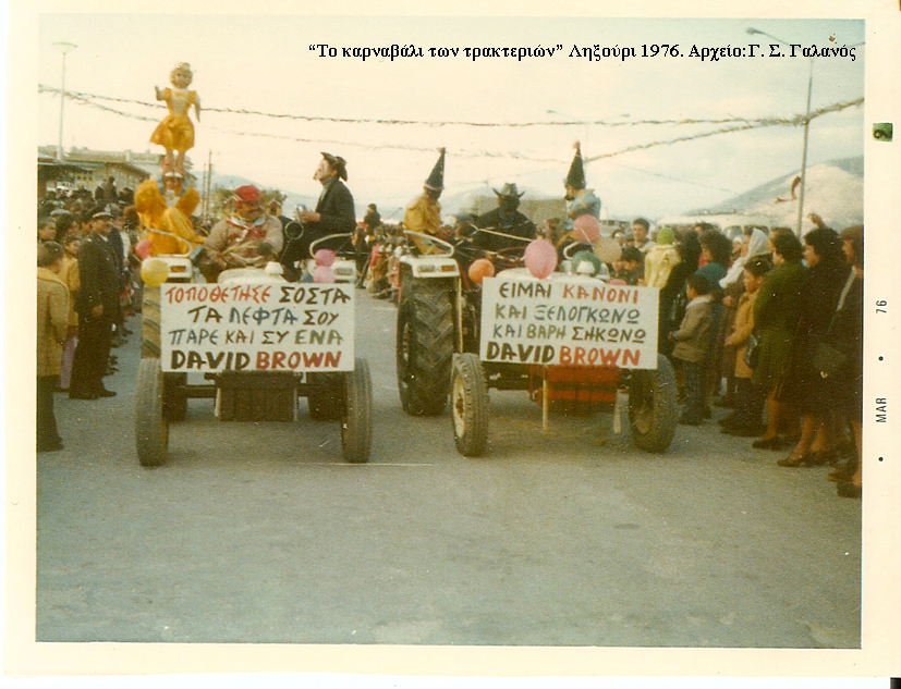 Ο Γιάννης Λαδάς ήταν από το 1970 αντιπρόσωπος στο νησί μας, μιας αγγλικής εταιρείας τρακτέρ, της DAVID BROWN, η οποία είχε παράρτημα στην Αθήνα, τη ΒΙΑΜΑΞ. Ο Γιάννης σκέφτηκε να κατεβάσει σε παρέλαση όλα τα τρακτέρ που έως τότε είχε πουλήσει. Έτσι, στο καρναβάλι του 1976 παρήλασαν τα 18 ρακτέρ της DAVID BROWN που έως εκείνη τη χρονιά είχαν πουληθεί στην Παλική.