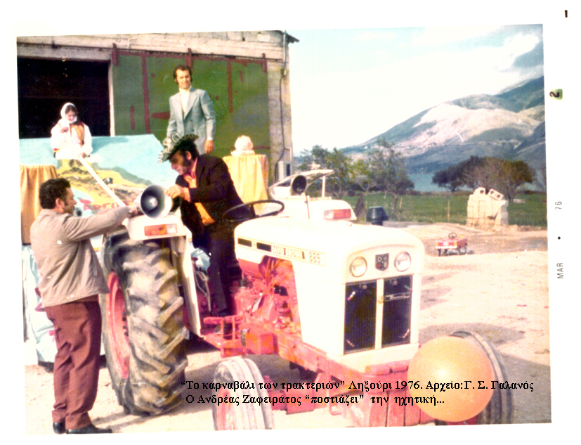 Επιβάλλεται μια αναφορά στους οδηγούς των τρακτέρ που με την παρουσία τους και τα οχήματά τους σφράγισαν εκείνη την καρναβαλική παρέλαση δίνοντάς την ονομασία: «Το Καρναβάλι των τρακτεριών». Σπύρος Πλάτωνα Τζουγανάτος από Ληξούρι, Ηλίας Πλατ. Τζουγανάτος από Μαντουκάτα, Κωνσταντακάτος Αδόλφος από Ληξούρι, Μπενάτος Γεράσιμος από Καλάτα, Μαρούλης Θεοδόσης από Καμιναράτα, Βαλλιάνος Γεράσιμος από Σουλλάρους, Μαντέλης Φώτης από Δαμουλιανάτα, Πυλαρινός Λίβος Σπύρος από Ληξούρι, Αντωνέλλος Σταύρος από Βουνί, Σπυράτος Γρηγόρης από Αγία Θέκλη, Σταθάτος Γεράσιμος από Ληξούρι, Βασιλάτος Χαράλαμπος Περδίκης από Ληξούρι, Άγγελος Ραζάτος από Βλιχάτα, Βεναρδάτος Βασίλειος, Κυριάκος Αραβαντινός Μαλλιώρης, Δημήτριος Πέτρου Δρακονταειδής, Χρήστος Παναγ. Μαρούλης από Μαντουκάτα, Νιοχωρίτης Βασίλειος (ο αγροφύλακας).