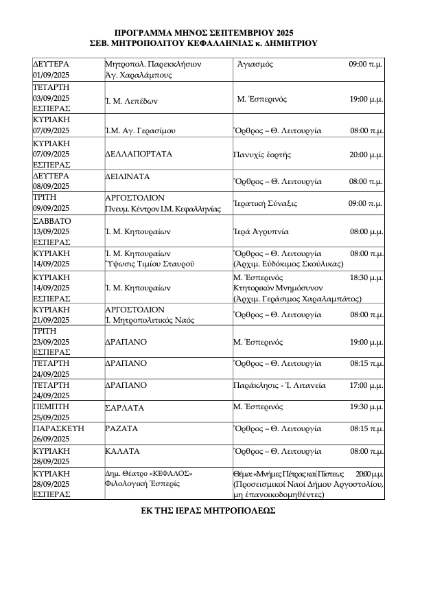 Το πρόγραμμα του Μητροπολίτη κ. Δημήτριου για τον μήνα Σεπτέμβριο