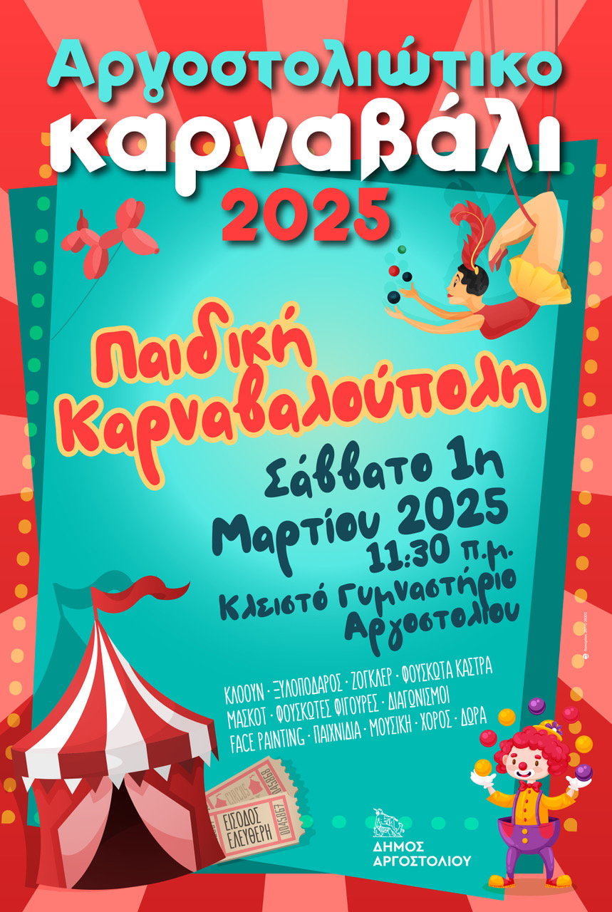 Το Σάββατο, 1η Μαρτίου στις 11.30πμ, ο Δήμος Αργοστολίου υποδέχεται την «Παιδική Καρναβαλούπολη», μια μοναδική γιορτή αφιερωμένη στους μικρούς μας φίλους στο Κλειστό Γυμναστήριο Αργοστολίου!