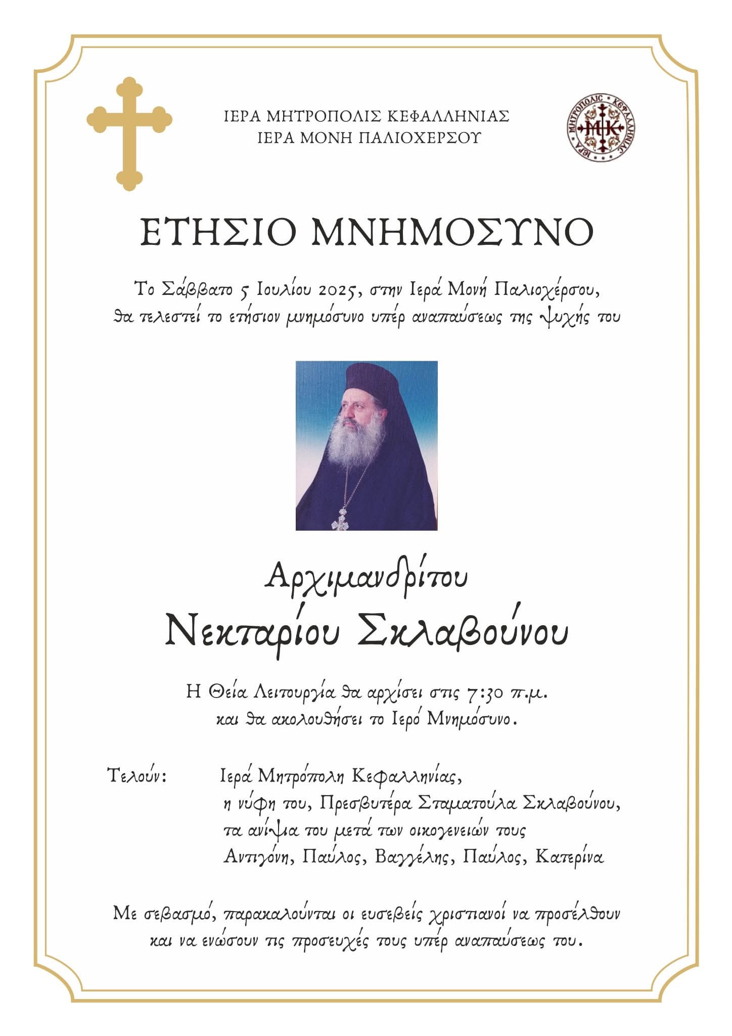 Το Πρόγραμμα του Σεβ. Μητροπολίτου Κεφαλληνίας Δημητρίου για τον Ιούλιο 2025