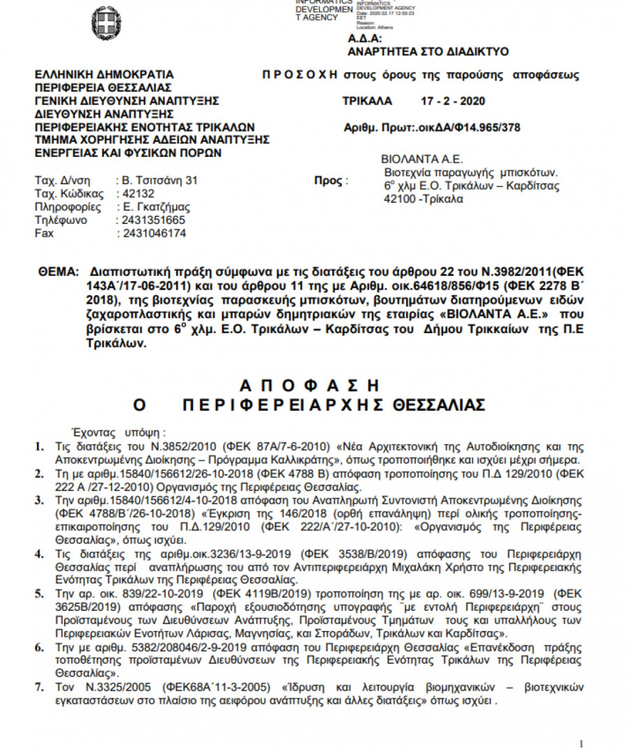 Παράλληλα, σε δεύτερο έγγραφο της Περιφέρειας, με ημερομηνία 19-2-2020, το οποίο πρόκειται για την άδεια λειτουργίας, αναφέρεται ότι η χορήγηση της άδειας γίνεται «με προθεσμία για τεχνική ανασυγκρότηση (με την επαναποτοθέτηση δεξαμενών υγραερίου σύμφωνα με την ισχύουσα νομοθεσία) της βιοτεχνίας παρασκευής μπισκότων».