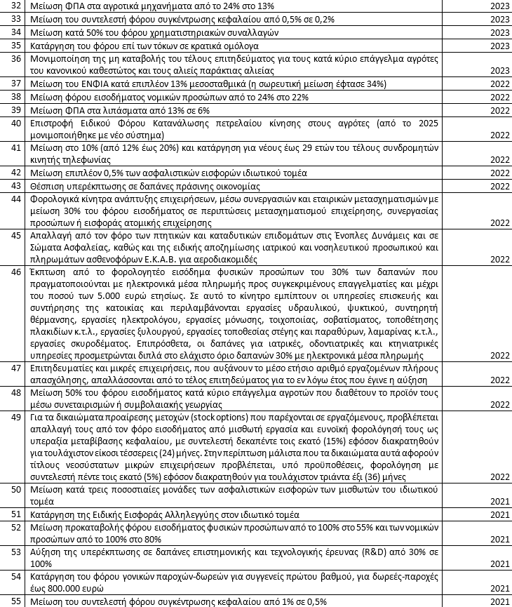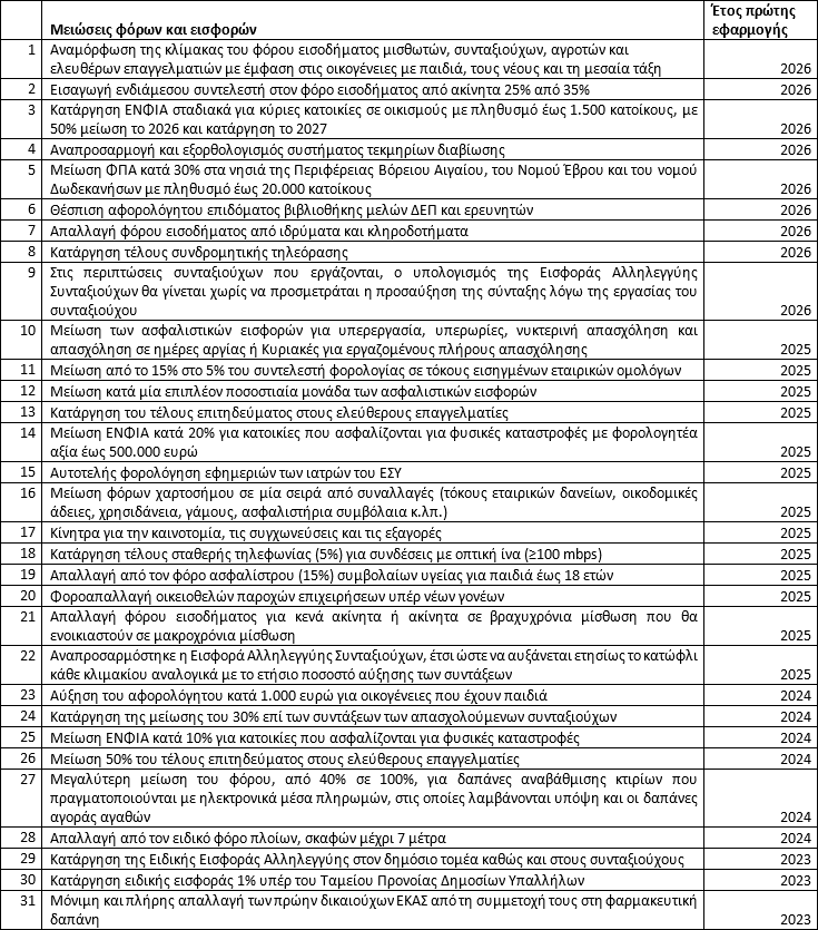 Σύμφωνα με ανακοίνωση του Υπουργείου Εθνικής Οικονομίας και Οικονομικών, η κυβέρνηση έχει προχωρήσει σε 83 μειώσεις φόρων και εισφορών συνολικά από την αρχή της θητείας της το 2019, με τους νέους φόρους που μειώνονται από την 1η Ιανουαρίου 2026, όπως ανακοινώθηκαν στη ΔΕΘ.