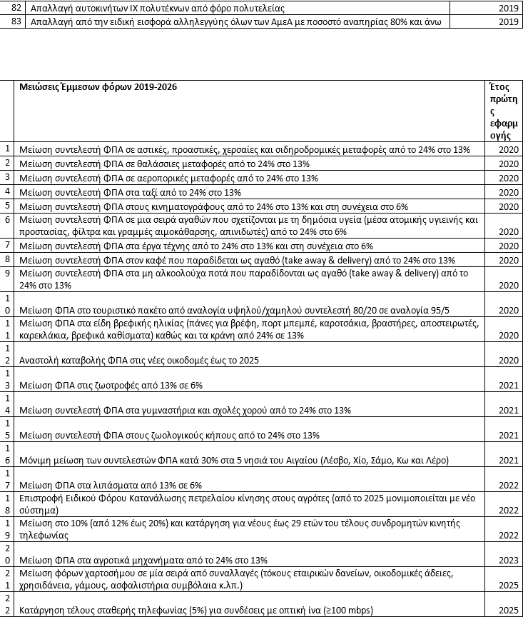 Από τις 83 μειώσεις φόρων και εισφορών, οι 25 αφορούν σε έμμεση φορολογία. Ανάμεσά τους είναι η μείωση του συντελεστή ΦΠΑ στις αστικές, προαστιακές και χερσαίες σιδηροδρομικές μεταφορές (στο 13% από 24%), η μείωση του ΦΠΑ στα είδη βρεφικής ηλικίας (13% από 24%) και η αναστολή καταβολής ΦΠΑ στις νέες οικοδομές.
