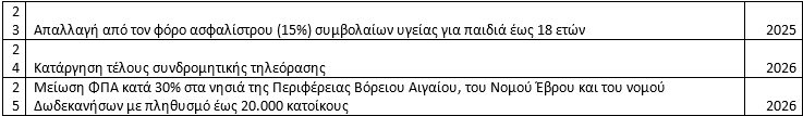 – Η σταδιακή κατάργηση του ΕΝΦΙΑ σε οικισμούς με πληθυσμό έως 1.500 κατοίκους (50% μείωση το 2026 και πλήρης κατάργηση το 2027).