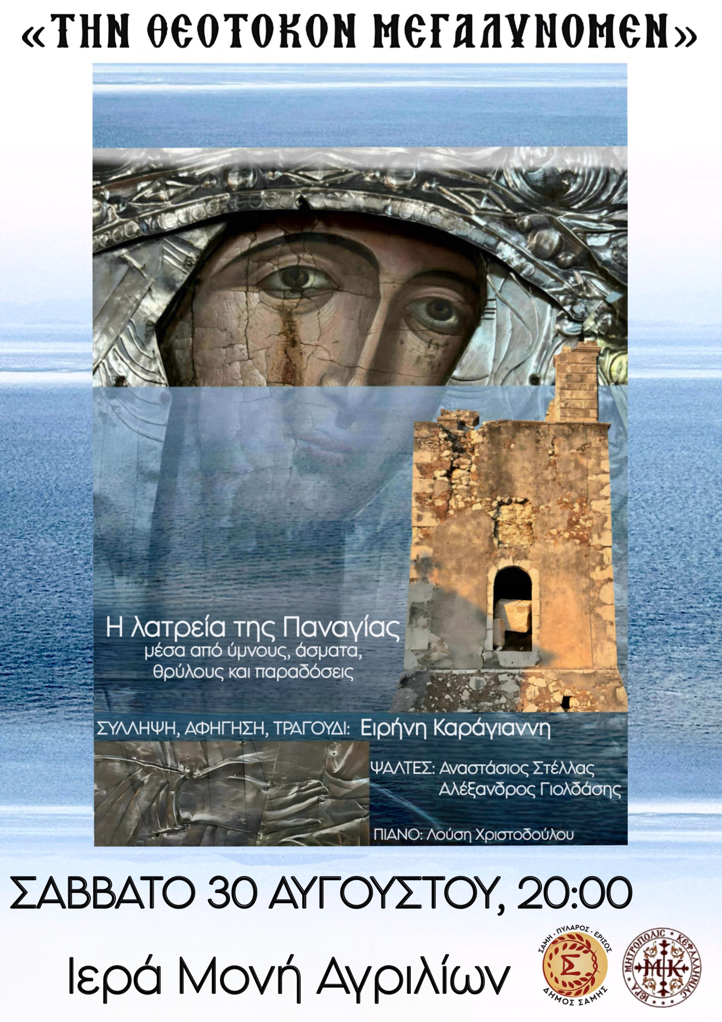 Ο Δήμος Σάμης σας ενημερώνει ότι το Σάββατο, 30 Αυγούστου θα πραγματοποιηθεί στα Αγρίλια και ώρα 20.00 εκδήλωση με τίτλο «Την Θεοτόκον Μεγαλύνομεν». Στο πλαίσιο της εκδήλωσης, που διοργανώνουν η Ιερά Μονή Κεφαλληνίας και η Ιερά Μονή Αγριλίων με τη στήριξη του Δήμου Σάμης, θα ακουστούν ύμνοι, άσματα, θρύλοι και παραδόσεις στην Παναγία. Σύλληψη, αφήγηση και τραγούδι: Ειρήνη Καράγιαννη, ψάλτες: Αναστάσιος Στέλλας, Αλέξανδρος Γιολδάσης.