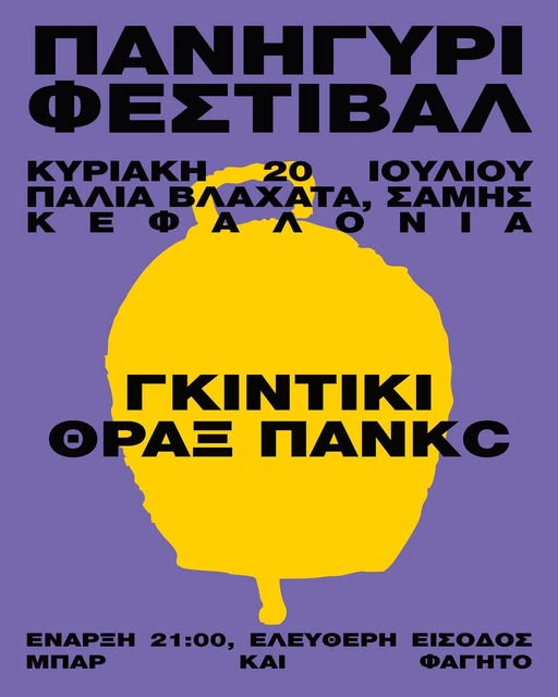 Ο Δήμος Σάμης σας ενημερώνει ότι σήμερα, Κυριακή 20 Ιουλίου 2025 και ώρα 21.00 θα πραγματοποιηθεί για ακόμη μια χρονιά το επιτυχημένο “ΠΑΝΗΓΥΡΙ ΦΕΣΤΙΒΑΛ” στα Παλιά Βλαχάτα Σάμης. Το Σαρίστρα φέρνει για πρώτη φορά στο νησί μας μετά την ευρωπαϊκή τους περιοδεία τους Γκιντίκι καθώς επίσης και τους Θραξ Πανκ, το μουσικό σχήμα με καταγωγή από τη Θράκη.